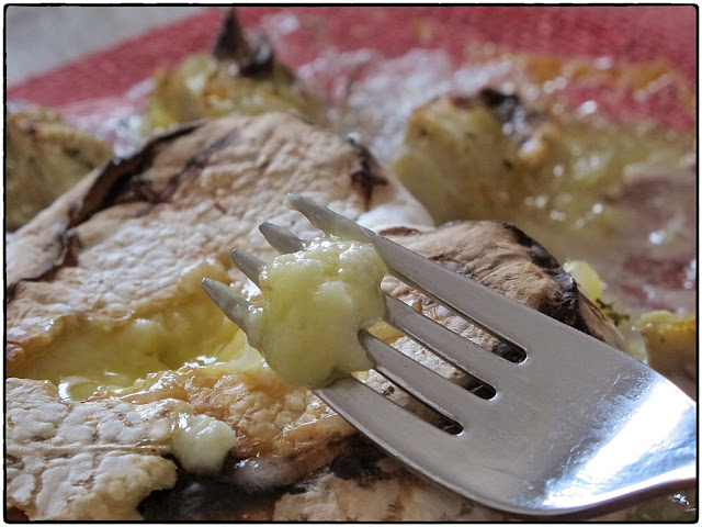 Slash an opening in the middle of the heart and stick a slither of garlic and the white wine in the cheese.
