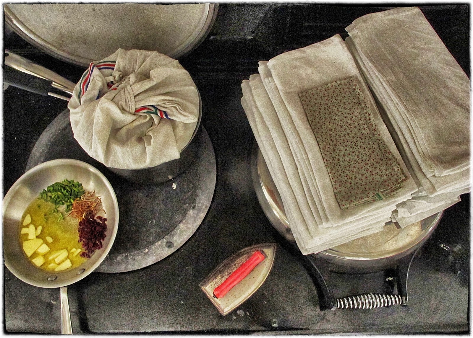 You will need either a couscousière (which I don’t have) or a fine mesh sieve/colander, plus a saucepan with a tight fitting lid and a clean tea towel.