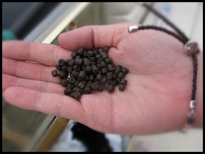 She throws handfuls of dark brown pellets into netted areas, like playpens, where the sea bass are grown. I eat a pellet: it has 22 components including sardines, grain, soya, ashes. It tastes not bad.