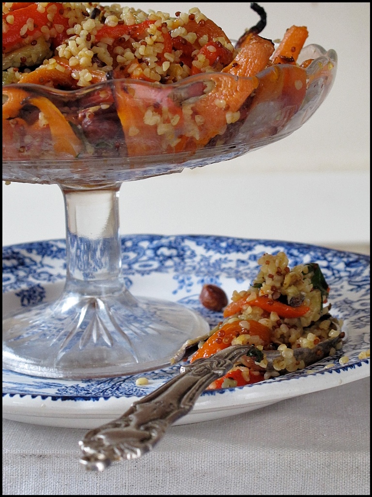 Bulgar wheat/Red Quinoa salad with hazelnuts and roast vegetables recipe