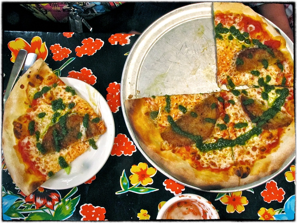 Even Italian/American foods such as this melanzane pizza, has green chile spread all over it.