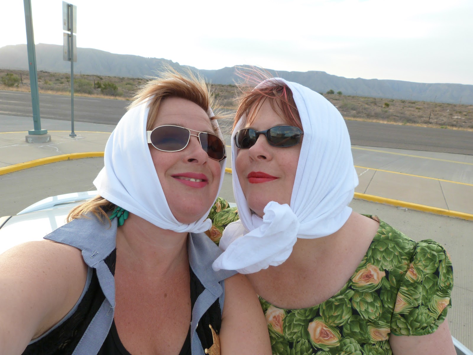 My sister and I recreating the Thelma and Louise selfie, in the nuclear testing desert of New Mexico, with the help of a restaurant serviette and a T shirt.