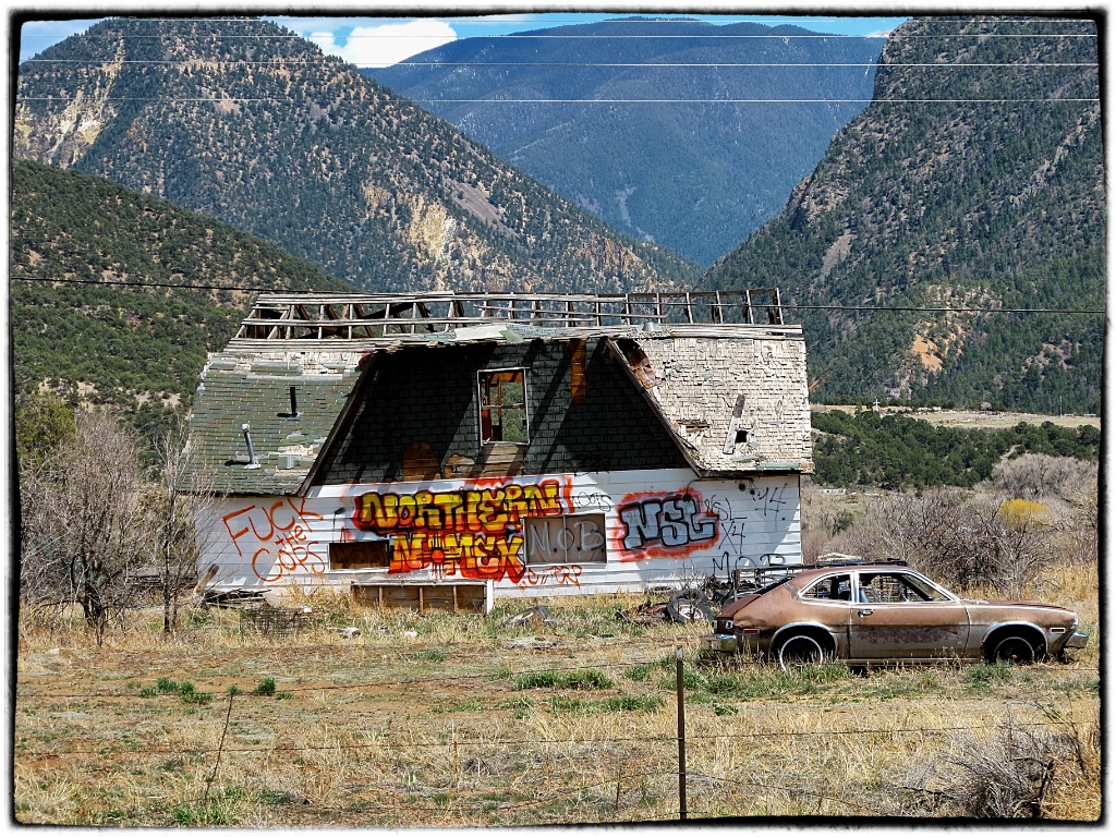 This house near Taos, with ‘Fuck the cops’ sprayed on it, was opposite the police station.