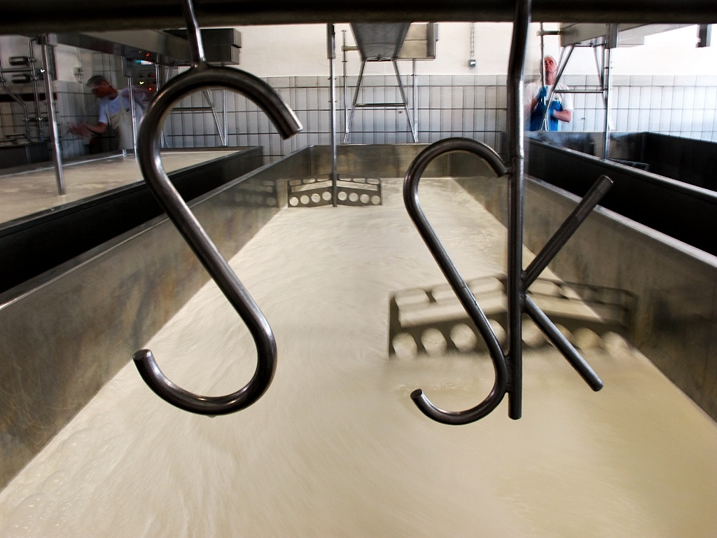 Left: the amount of P. roqueforti needed for one of these huge tanks of curds. |
