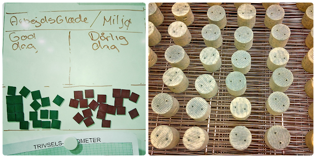 | Left: A notice board in the dairy where employees can say whether they had a good day or a bad day. Cute, eh? Right: mini blue cheeses. |