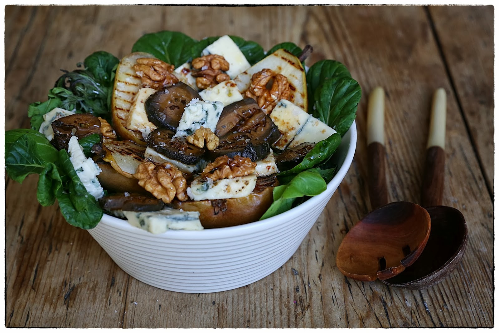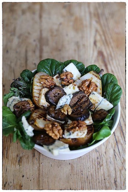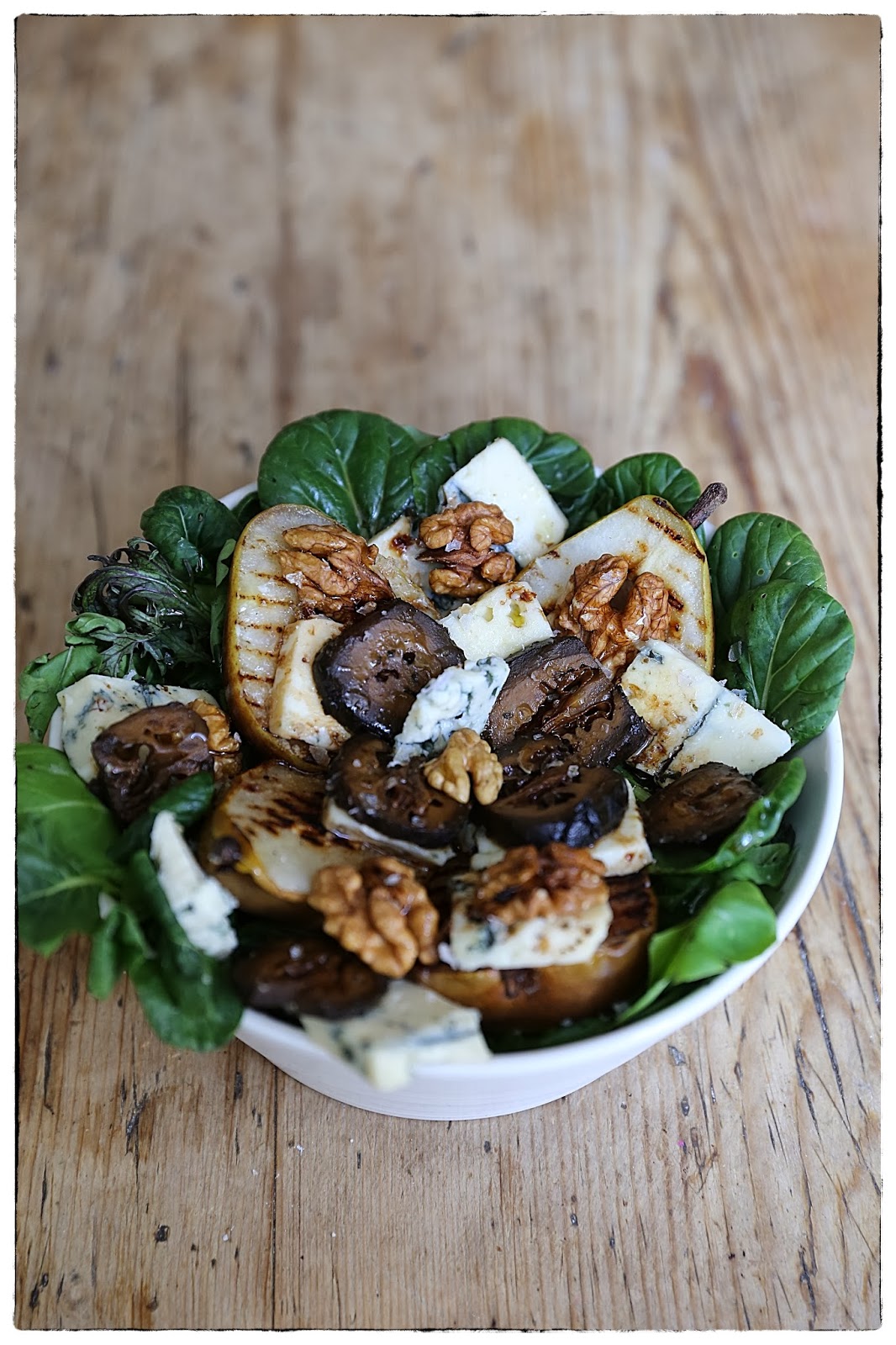 Recipe for walnut, pickled walnut, grilled pear and blue