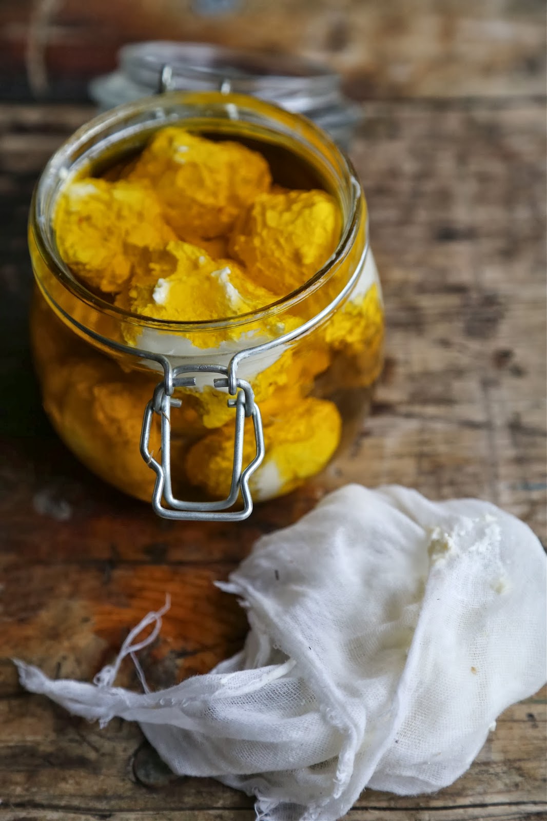 Take the labneh cheese and roll it into golf ball size rounds and place them into the olive oil filled jar. Make sure the balls are covered with oil when you have filled the jar.