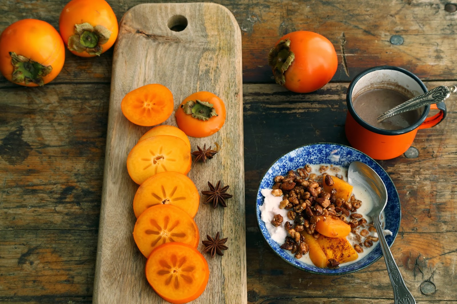 Cut up the persimmon into chunks. Place in a saucepan with a star anise, a few scrapings of nutmeg, a pinch of ground cloves and a tablespoon of honey. Simmer until warm.