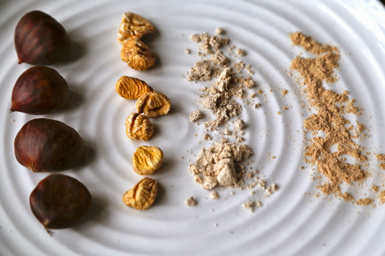 Fresh European chestnuts, dried chestnuts, chestnut flour, smoked chestnut flour. Some of these I bought at the chestnut museum in Alentejo, Portugal