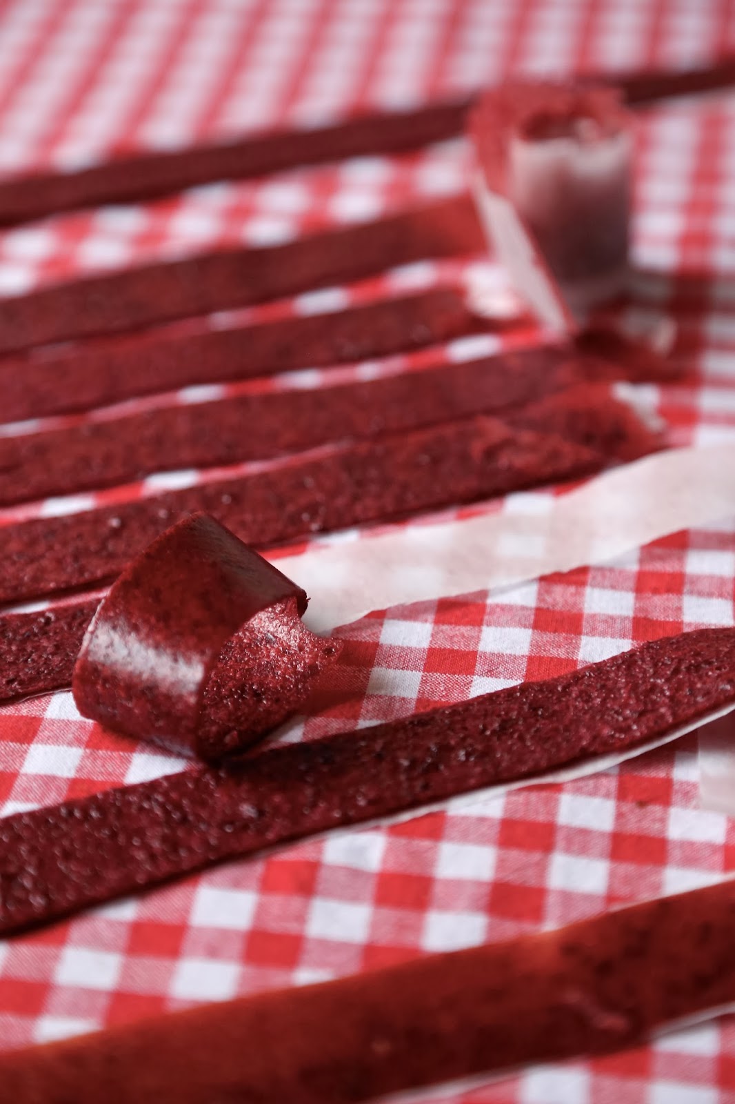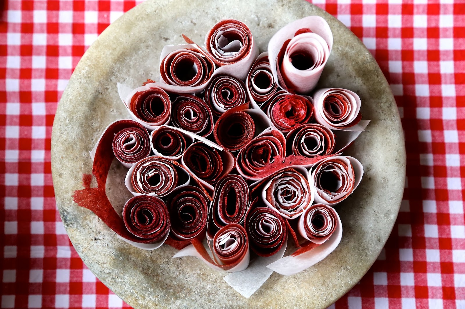 When it’s sufficiently dried out, carefully peel the leather off the silicone sheet and place it onto parchment paper. Cut it into strips and roll it.