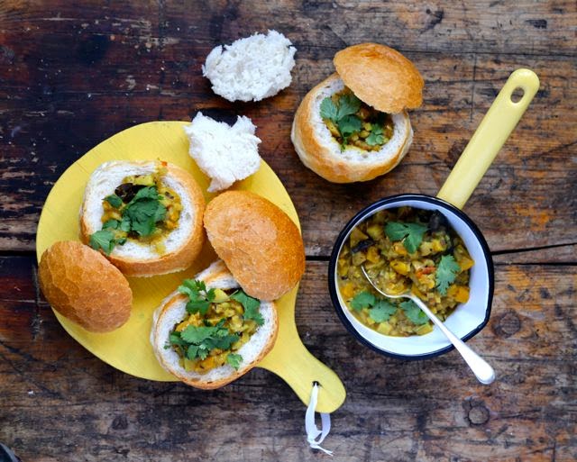 Bunny chow is a South African street food, part of its ‘rainbow cuisine’, with influences from indigenous tribal cooking, Malaysian, British, Afrikaans/Dutch and Indian food. It is similar to the trenchers that medieval Britons used, prior to the generalised use of cutlery, which was a stale hollowed-out loaf, a carrier for the food. The advantage being that, once the sauce has softened the bread, you can supplement the dish by tearing off and eating some of the trencher.