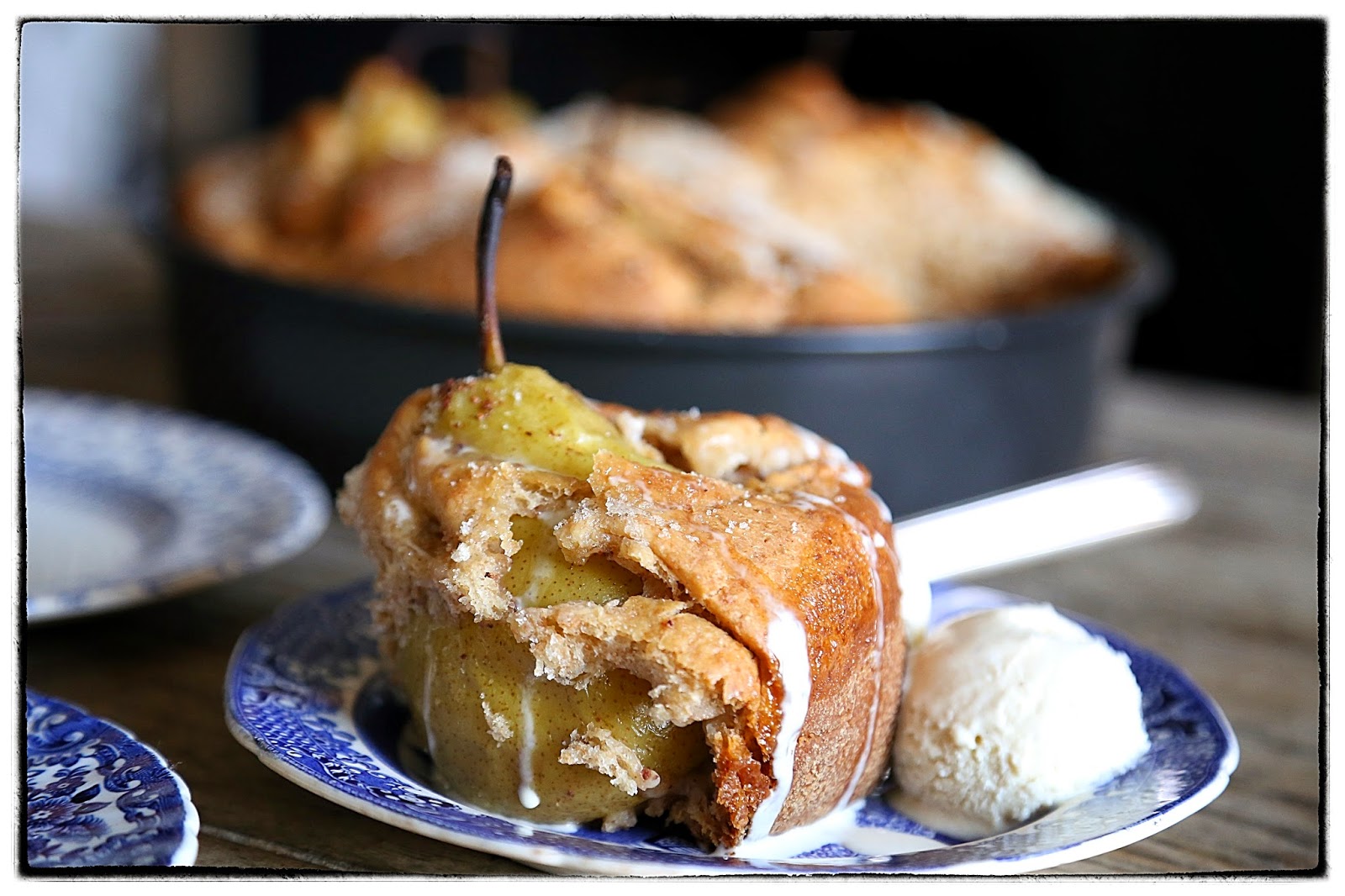 Take each of your cool pears and dip them in a bowl of flour, this will enable the dough to stick to the pear. Then cut the rectangle of dough into 6 cross sections. Lay the pear on the dough at the end of the strip and roll the dough around it. Then squash the doughy pears into a large greased and floured cake tin, so that the stems of the pears are facing upwards. Cover and let them to rise somewhere warm until doubled in size.