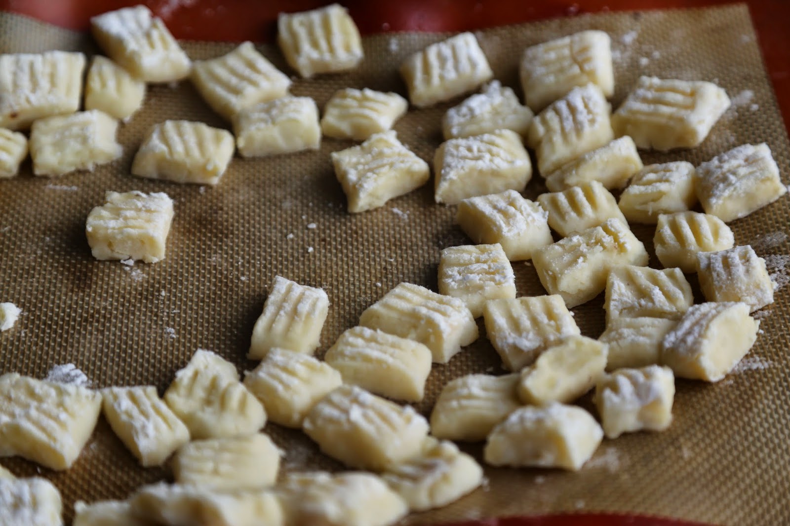 Roll the mixture out into a thin sausage of 2 cm/3/4 inch diameter). Using a sharp knife, cut the rope into 2cm/3/4 inch lengths. Press down with a fork on each little gnocchi.