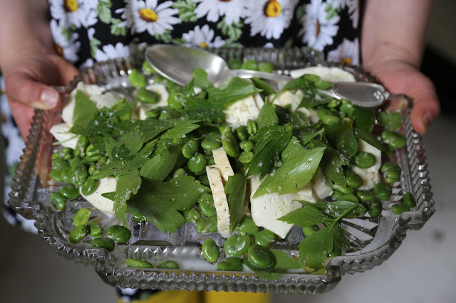 I paired it with lovage, which grows in my garden. In Sweden you can buy lovage and many unusual herbs in supermarkets, whereas our UK supermarkets stock a very limited range of herbs. Lovage has a slight celery flavour and a pleasing bitterness that matches well with mozzarella. I then added double-podded tender grass green broad beans and finished with lemon juice and hay smoked rapeseed oil. This recipe is gorgeous.