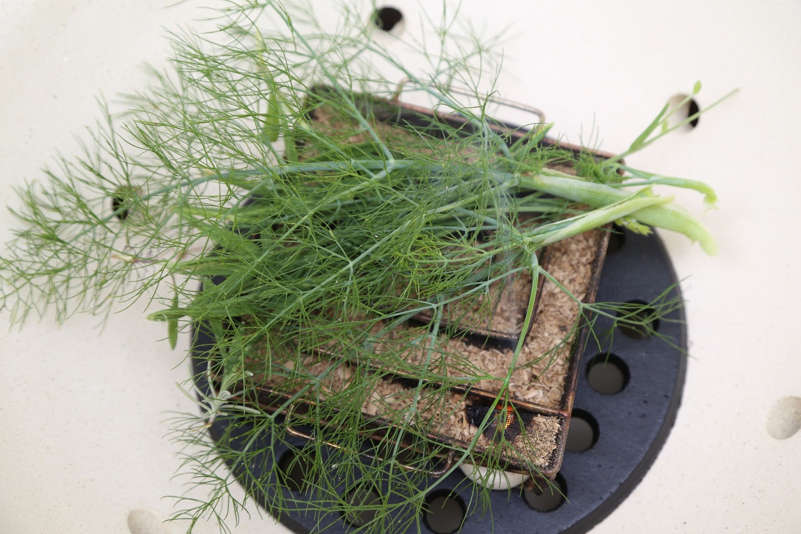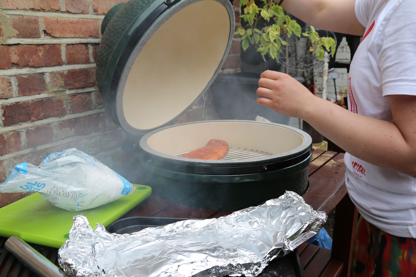 I put this on the bottom grill in the BGE and overlaid it with herbs to add even more flavour. The mozzarella took only half an hour to be smoked but a side of salmon would take at least six hours. If smoking fish when the weather is very warm or there is too much heat, you can lay the salmon on tin foil and surround it with ice cubes to bring the temperature down. (There is a temperature gauge in the BGE.)