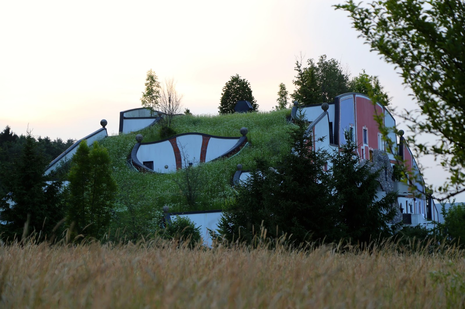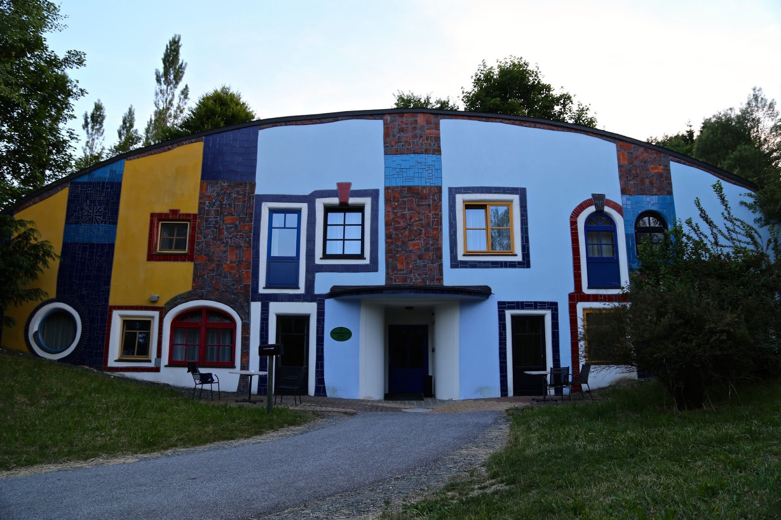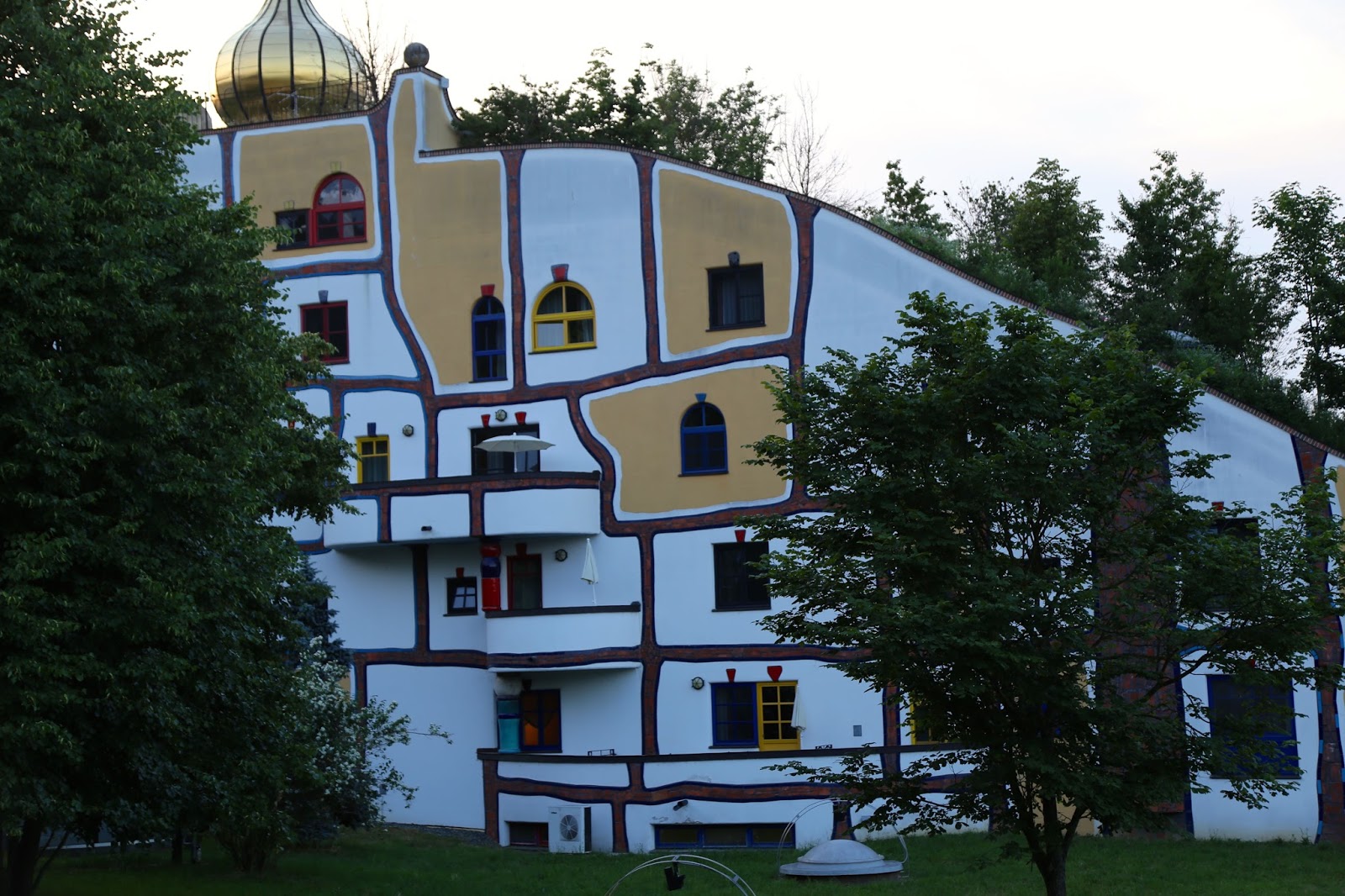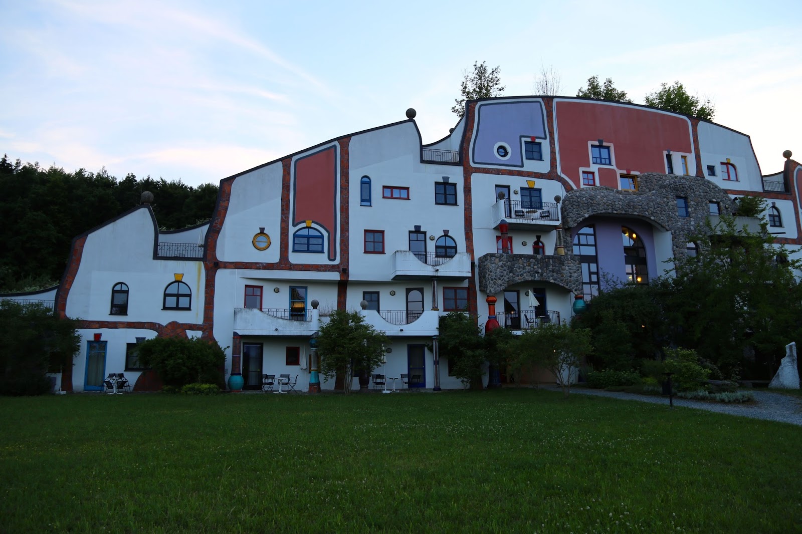 The photos below show the hotel that I stayed in when I visited the region of Styria in Austria, which was also designed by Hundertwasser. The swimming pool filled with volcanic highly mineralised water was a particular joy, with an intertwining weaving swimming pool going indoors and out. Many Viennese visit in winter for the wellness spa facilities, the organic natural food, the countryside. For more details go to the Hotel Rogner Bad Blumau site.