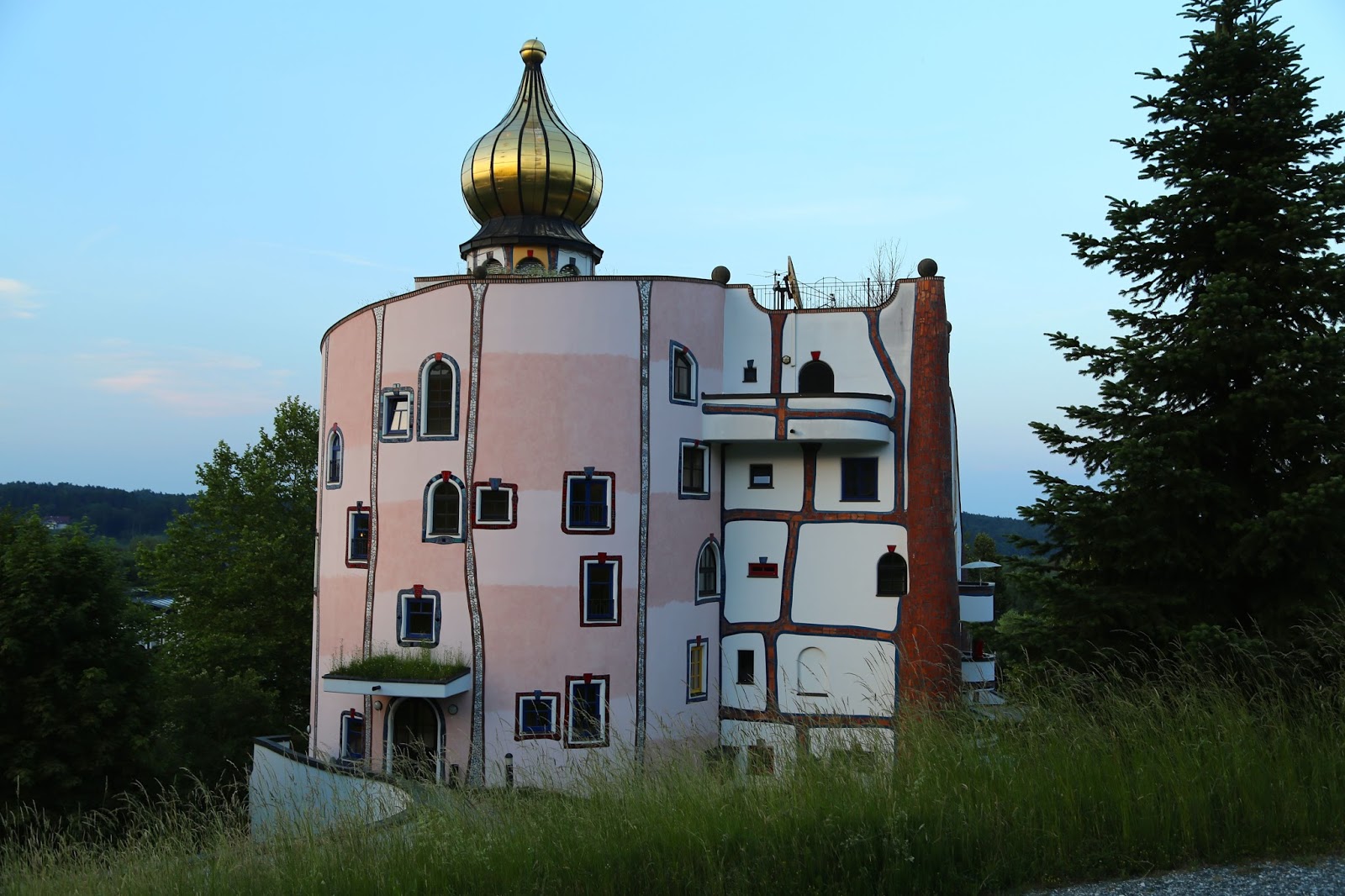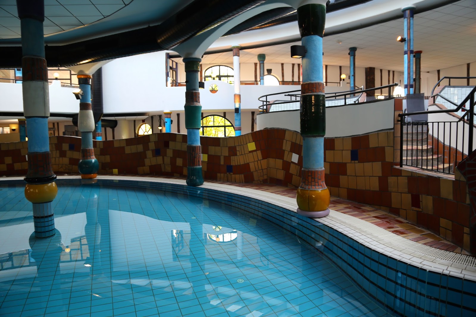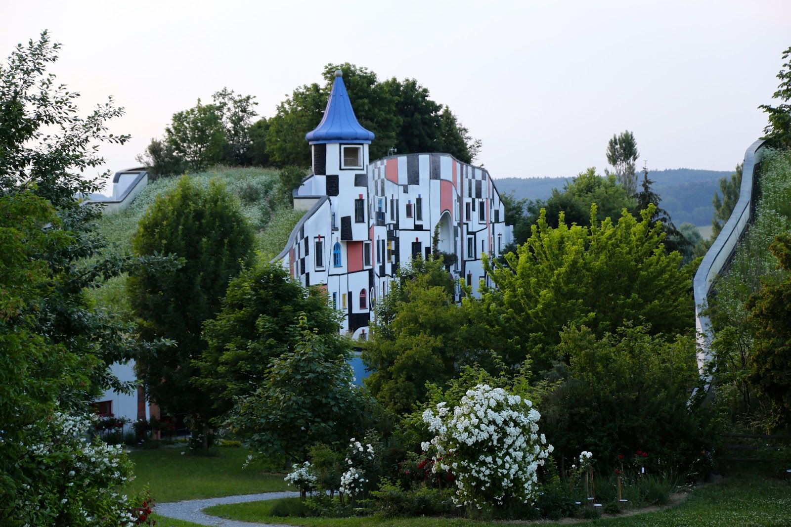 The photos below show the hotel that I stayed in when I visited the region of Styria in Austria, which was also designed by Hundertwasser. The swimming pool filled with volcanic highly mineralised water was a particular joy, with an intertwining weaving swimming pool going indoors and out. Many Viennese visit in winter for the wellness spa facilities, the organic natural food, the countryside. For more details go to the Hotel Rogner Bad Blumau site.
