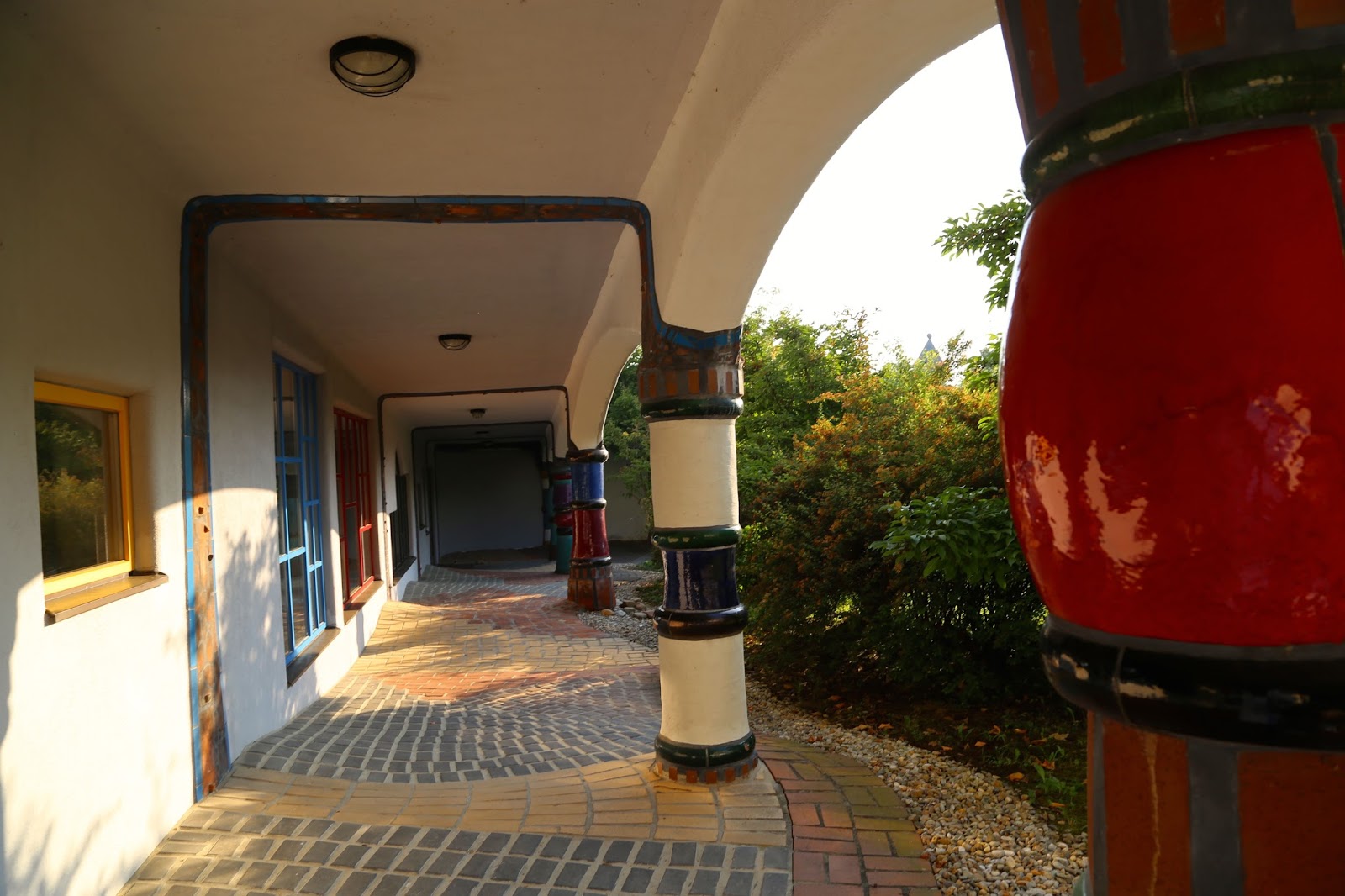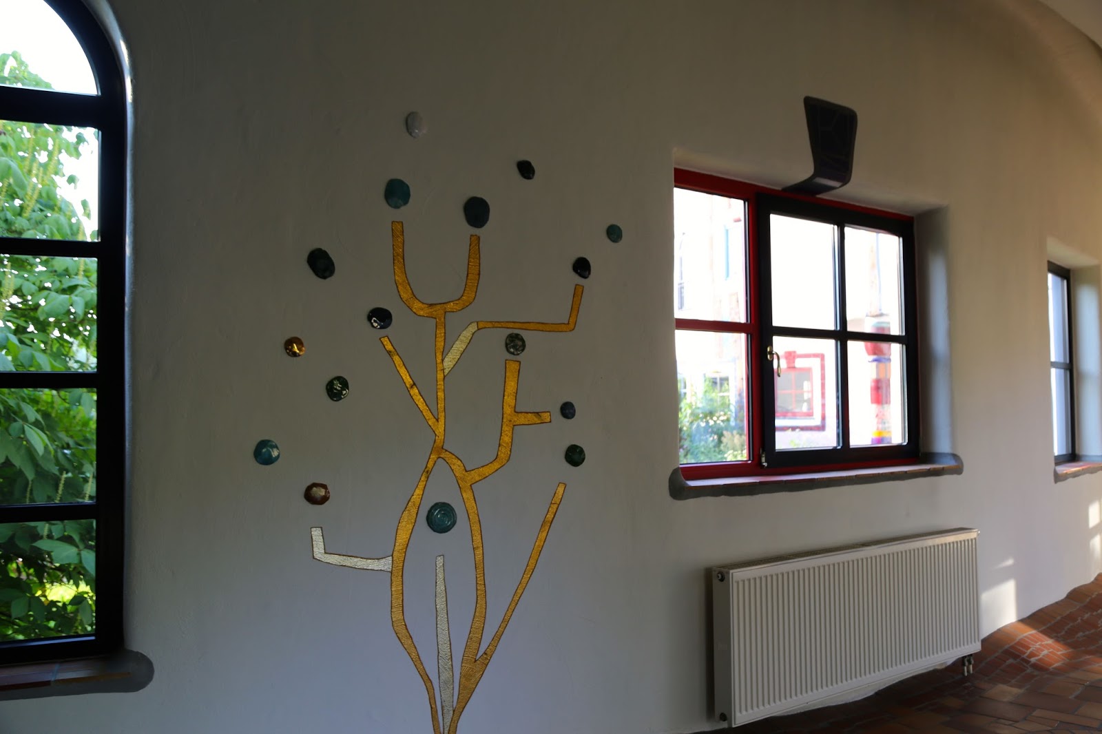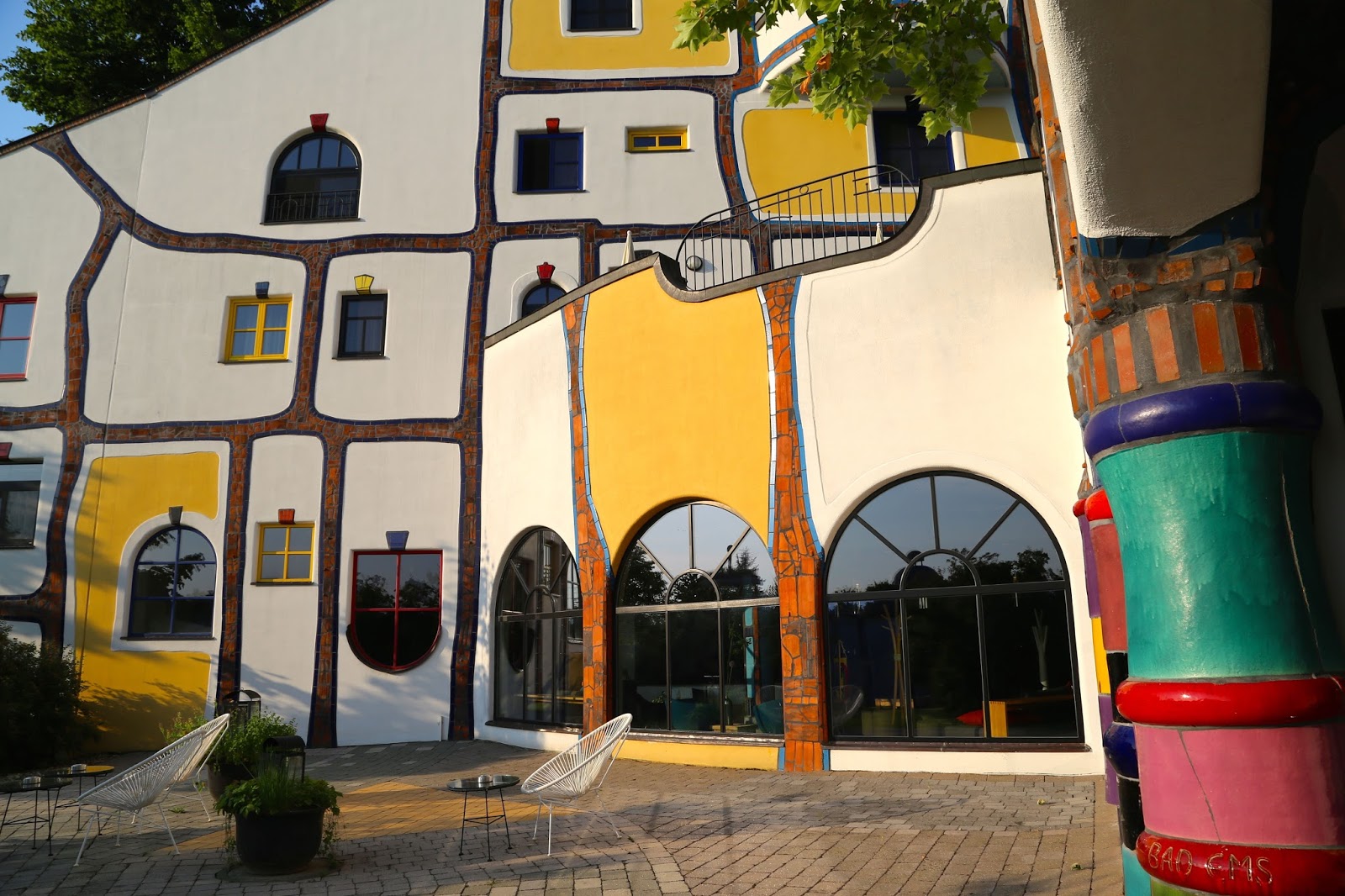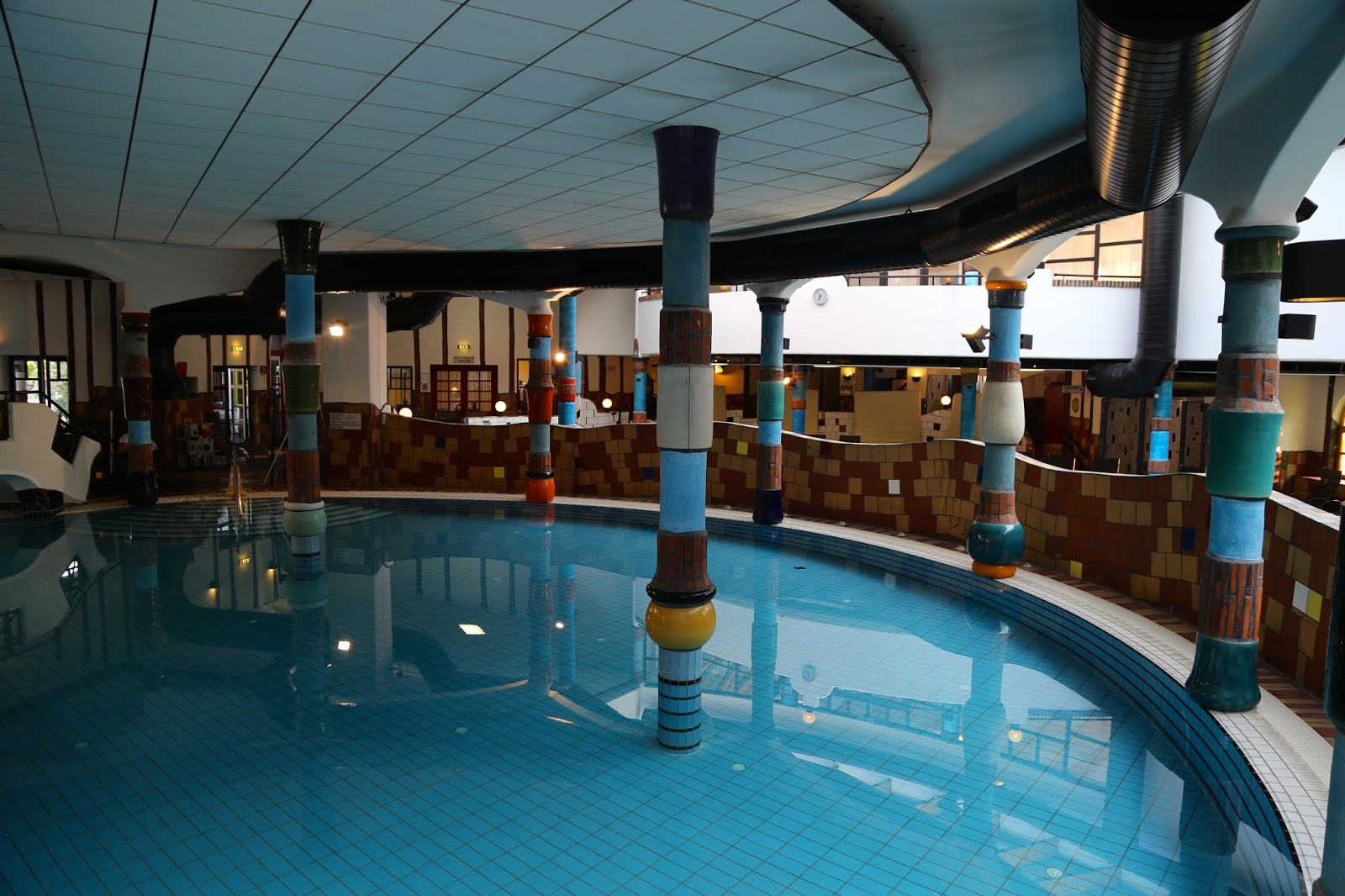 The photos below show the hotel that I stayed in when I visited the region of Styria in Austria, which was also designed by Hundertwasser. The swimming pool filled with volcanic highly mineralised water was a particular joy, with an intertwining weaving swimming pool going indoors and out. Many Viennese visit in winter for the wellness spa facilities, the organic natural food, the countryside. For more details go to the Hotel Rogner Bad Blumau site.
