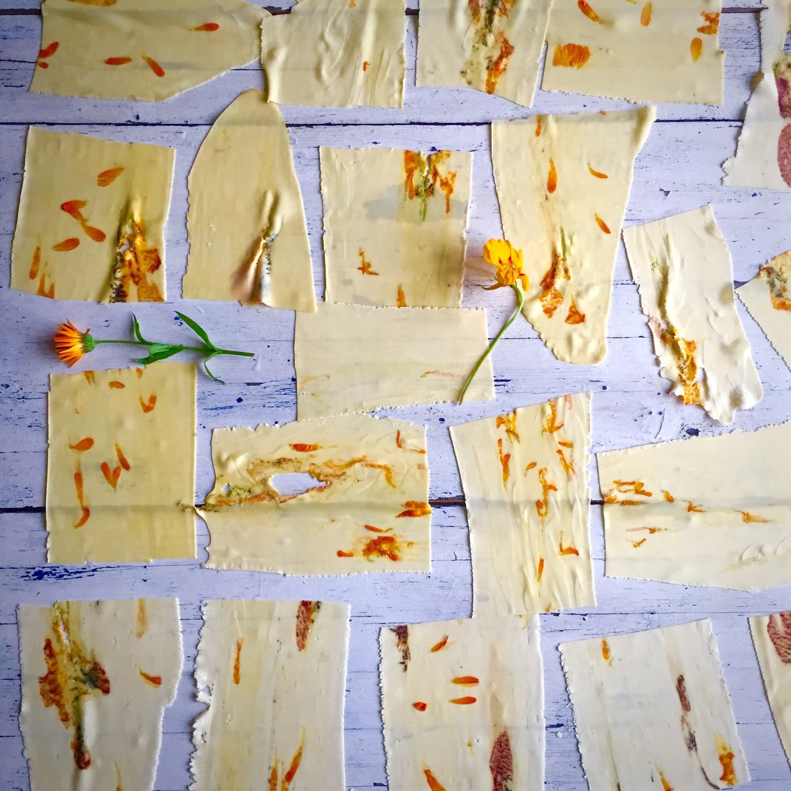 Then run the pasta through the machine on the narrower setting. Add geranium petals, dill fronds, nasturtium flowers and leaves, sage or other herbs on settings 4, 5, 6. Keep running the pasta through the machine on narrower and narrower settings until the pasta will be very fine, till the point you can see your hand through it. The flowers and herbs will stretch as you go. Keep going until the last setting when it will be three times as long. You’ll probably need to cut it in half during this process.