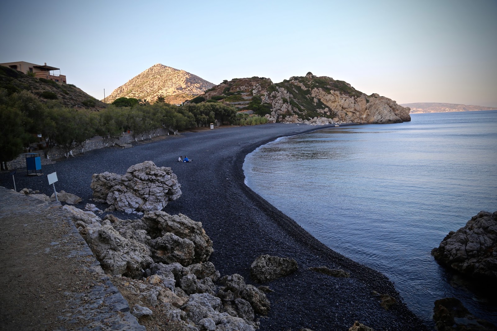 The black pebbled beach at Mavra Vollia which are used in pathways of posh Genovese architecture below