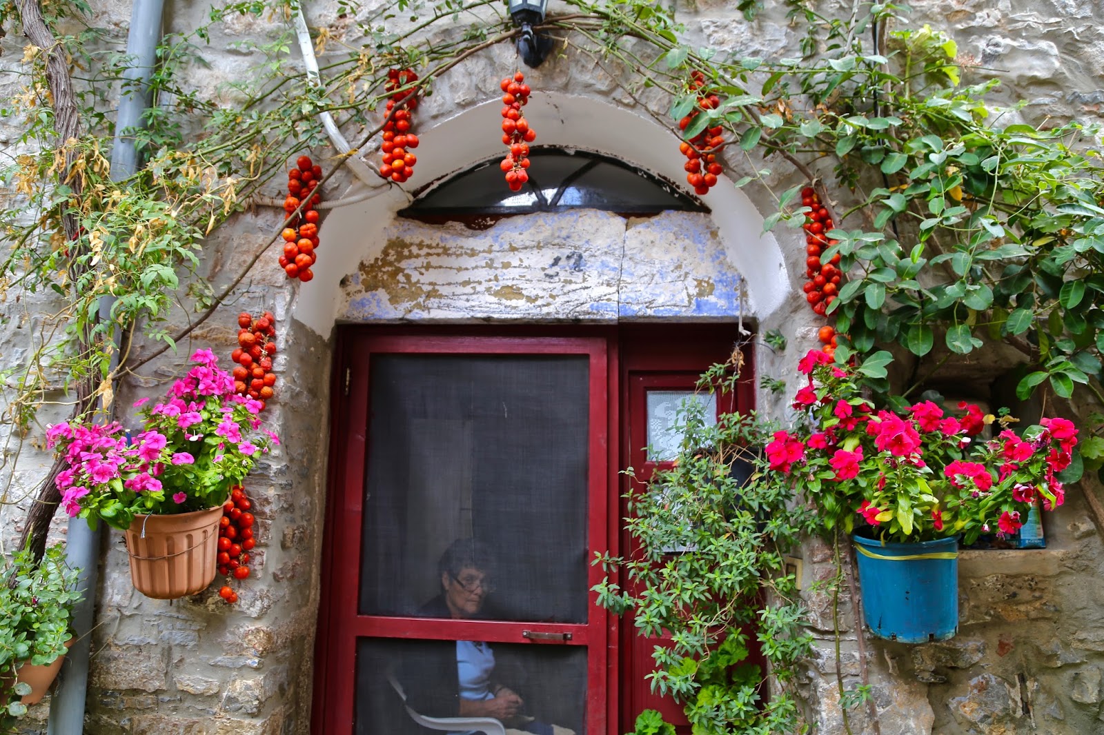 Drying tomatoes strung up on the walls.