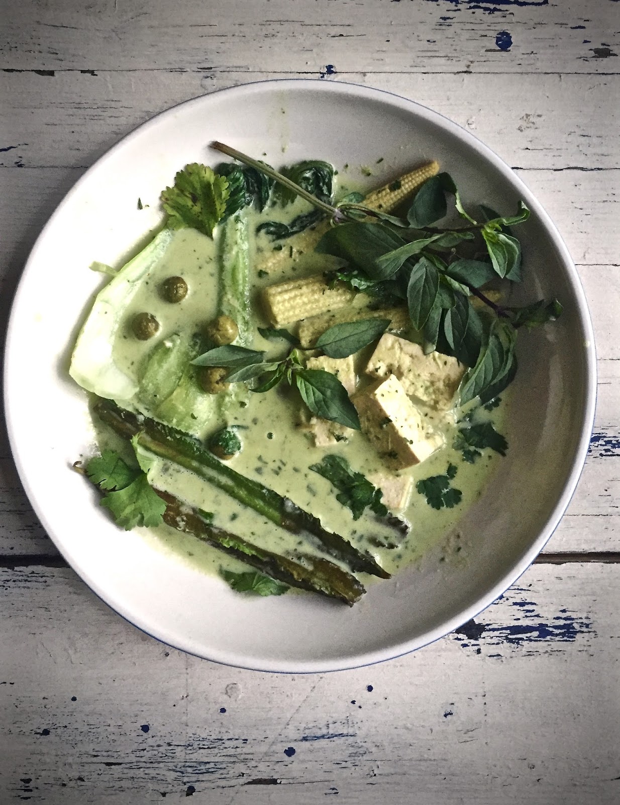To make a proper green curry you need the right ingredients. Look in your local Asian supermarket which might have ingredients such as holy basil, kaffir lime, pea aubergines, bunches of coriander with the roots, fresh lime leaves, galangal and tiny Asian shallots. Tofu, lemon grass, palm sugar, birds eye chillies, dried lime leaves plus coconut milk and cream are usually available in our normal high street supermarkets. I tend to make a special trip to get all the unusual ingredients together then make a large batch of the green curry paste which can be separated into portions and frozen.  If it isn’t possible to go to an Asian supermarket, basil is a substitute for holy basil and sliced baby aubergines will do for pea aubergines.   Sometimes Waitrose or Ocado has Thai basil.