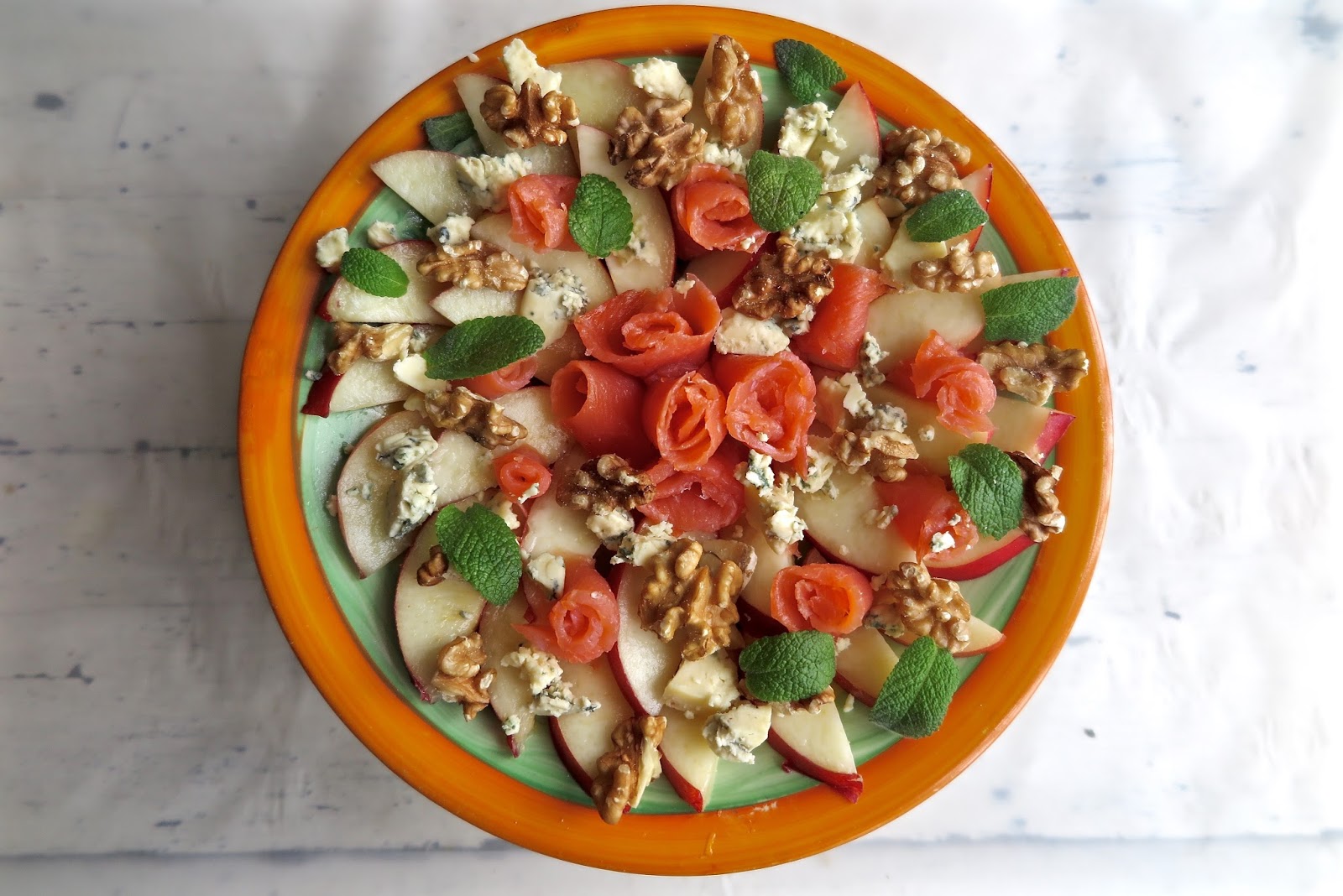 Smoked salmon, nectarine, walnut and blue cheese salad