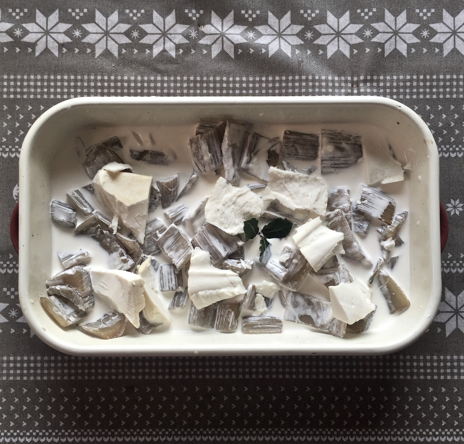Drain but reserve the cardoon water. Preheat the oven to 180ºc. Butter a baking dish 20cm x 10cm approximately.