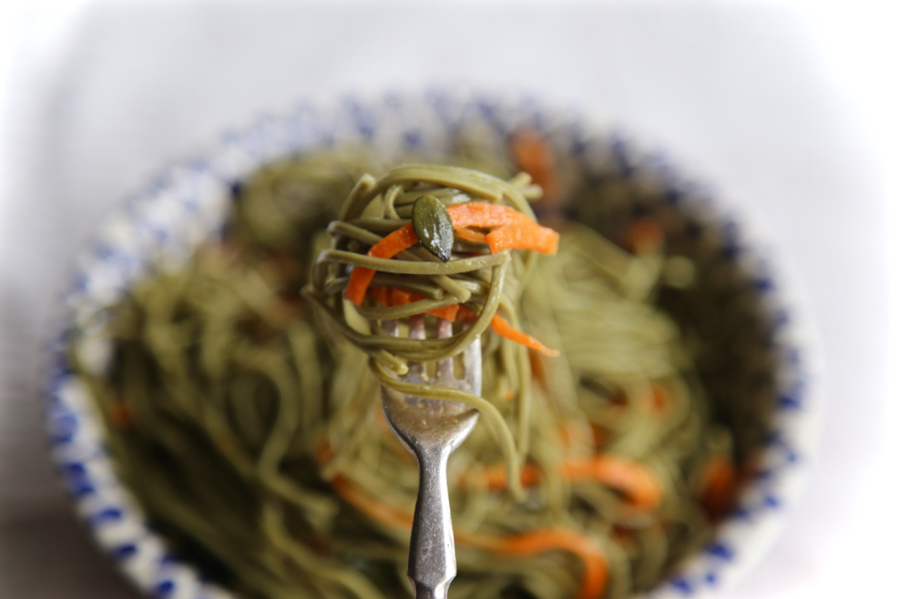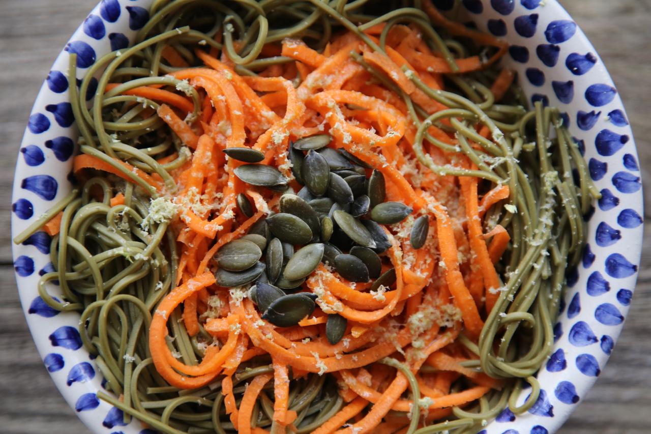 Carrot ‘noodles’ with matcha noodles and wasabi dressing