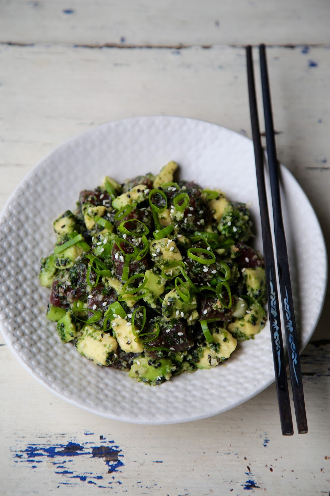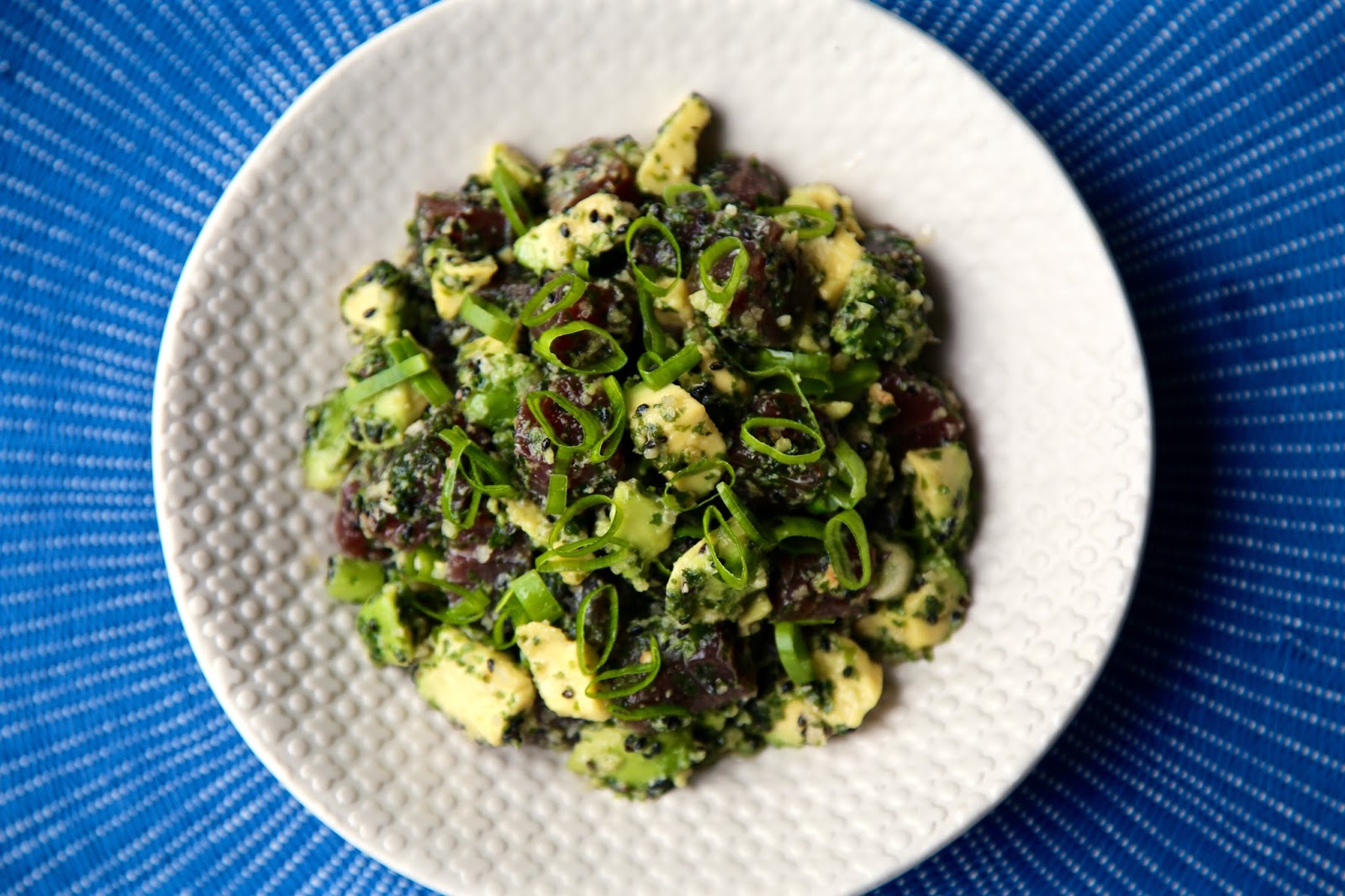 Then add the tuna, spring onions, avocado and candlenuts to the marinade. Toss and chill for half an hour. Eat with steamed sushi rice.