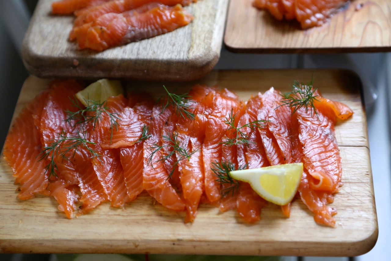 Remove from the fridge and cut a little slice from the centre of the salmon. Does it taste cured and not raw? Then it is ready. (If it is too salty, you can rinse the salmon.)