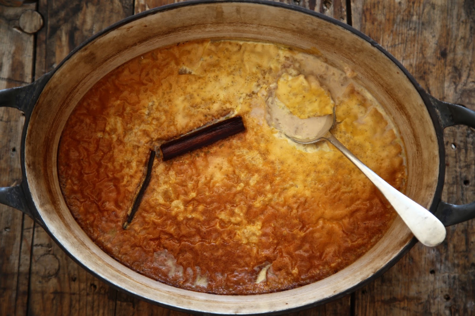 The next day I tested it again, this time with Spanish paella rice. Not La Bomba but better quality than the ole (very ole) pudding rice. I omitted the orange peel using only the zest as the pith is the bitter part. I added more sugar and less milk while leaving it in the bottom oven overnight.