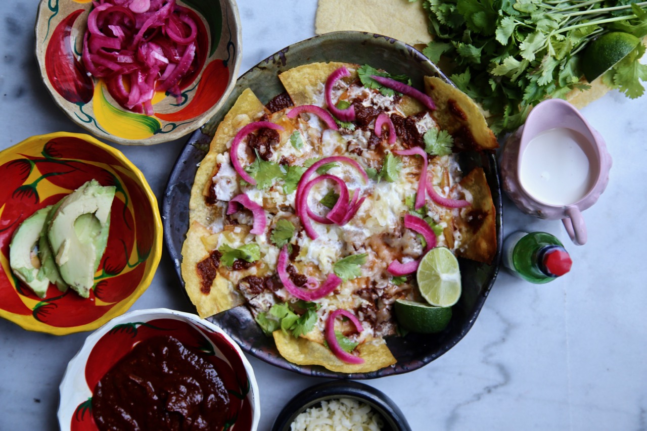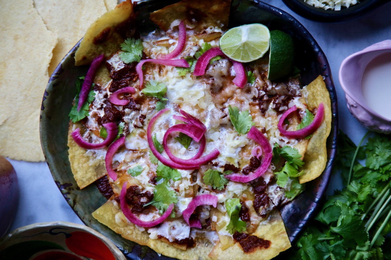 They come with either a red or green sauce. The red sauce is with ‘jitomate’ (red tomatoes) and the green is based on tomatillos. You can also have them topped with chicken or eggs. My recipe is vegetarian, so pink pickled onions and avocado slices are my topping suggestions.
