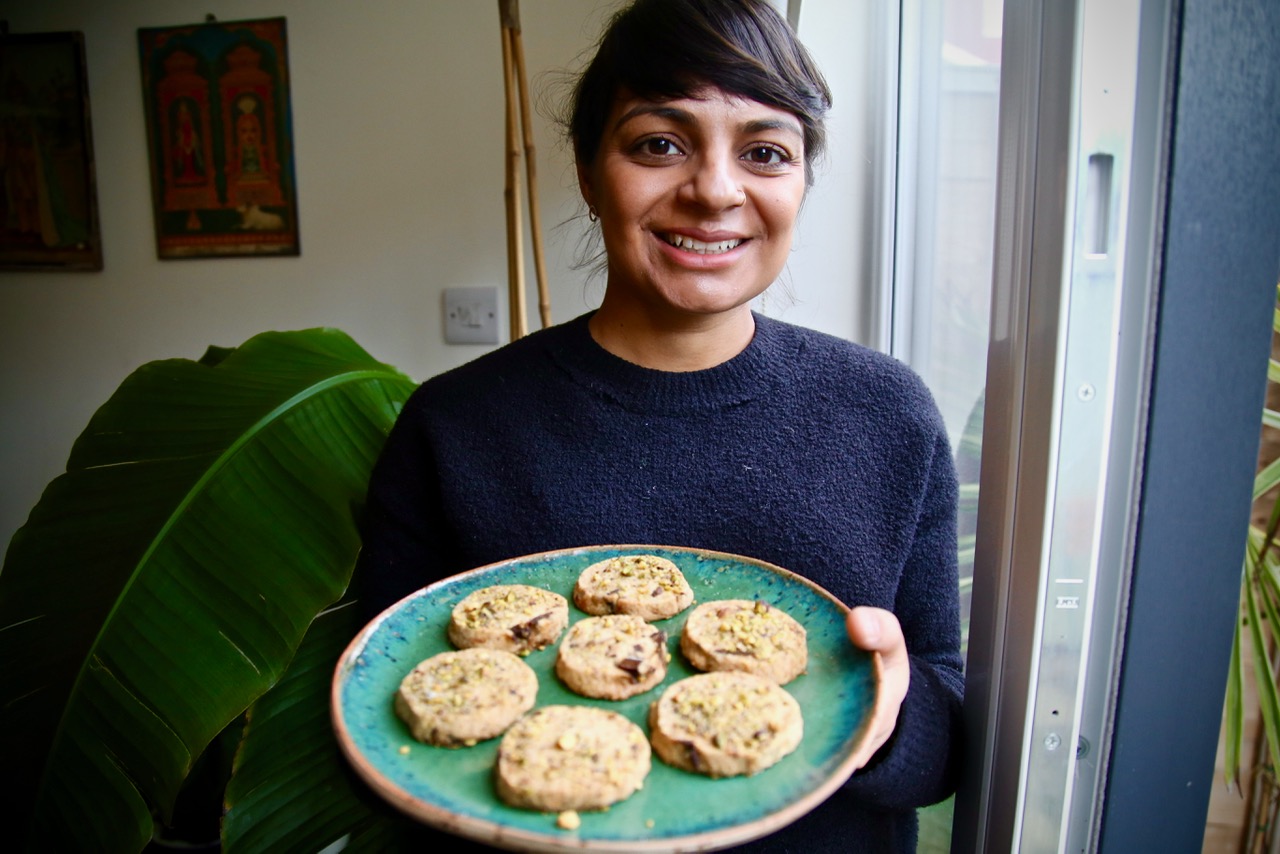 Meera and her husband haven’t been here long. Meera is pregnant, her baby due in February. We sit in the kitchen near the window. She has baked some Indian spiced cookies: thick rounds of crumbly shortbread studded with leaf green pistachios. They are delicious.