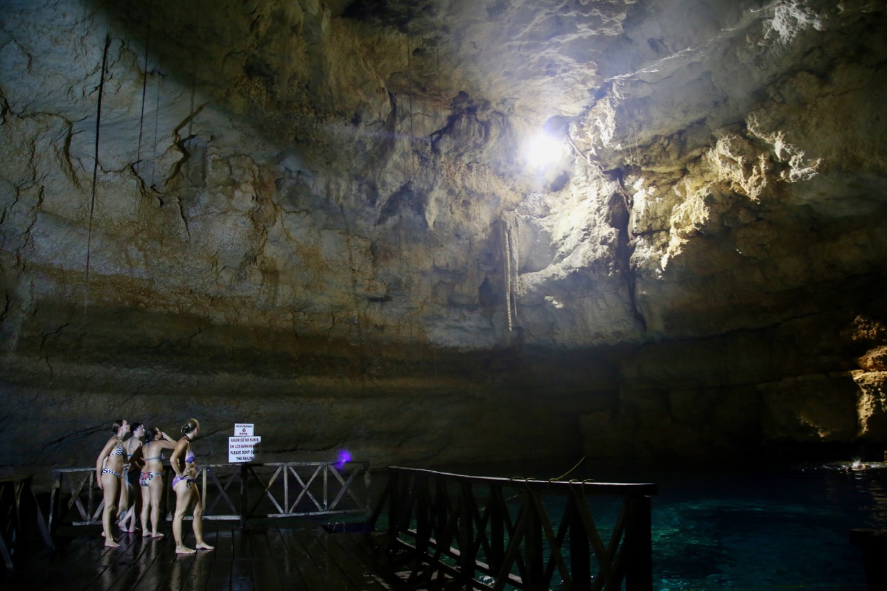 Coba is famous for Mayan ruins, pyramids that are sickeningly steep to ascend and cenotes, fresh water pools, many underground. I cycle nine kilometres to the most dramatic cenote, a vast turquoise cavern accessible via a slippery wooden circular stairway several floors down.