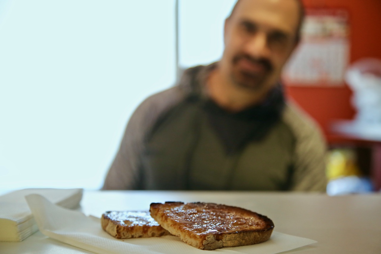 We have some traditional Portuguese bread, pao casero. House bread, made of rye, and the Portuguese custard tart.