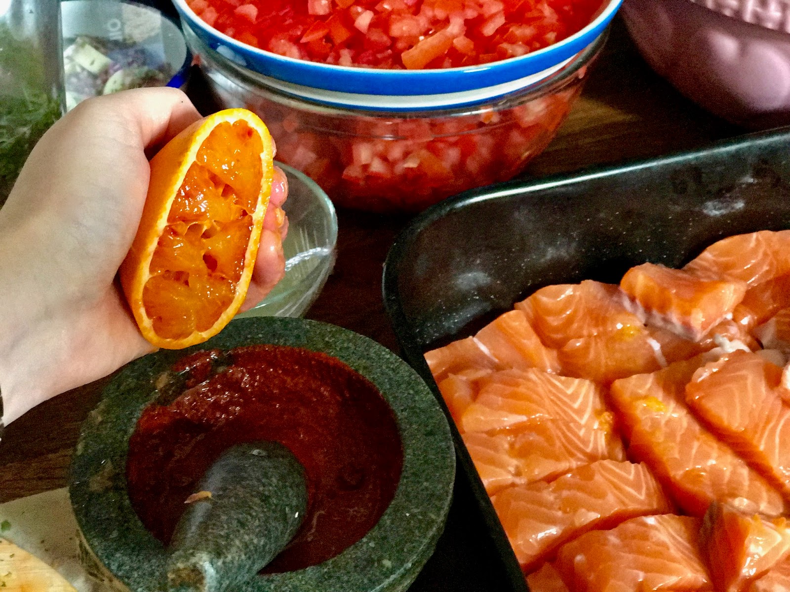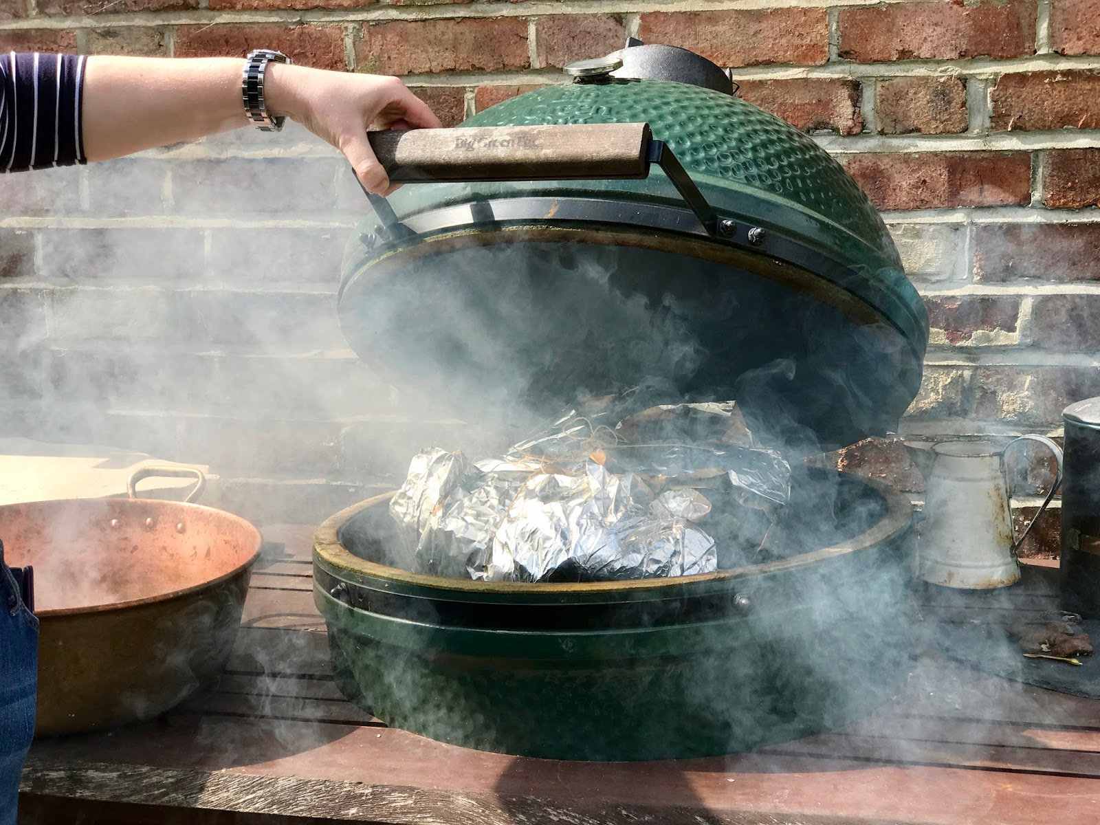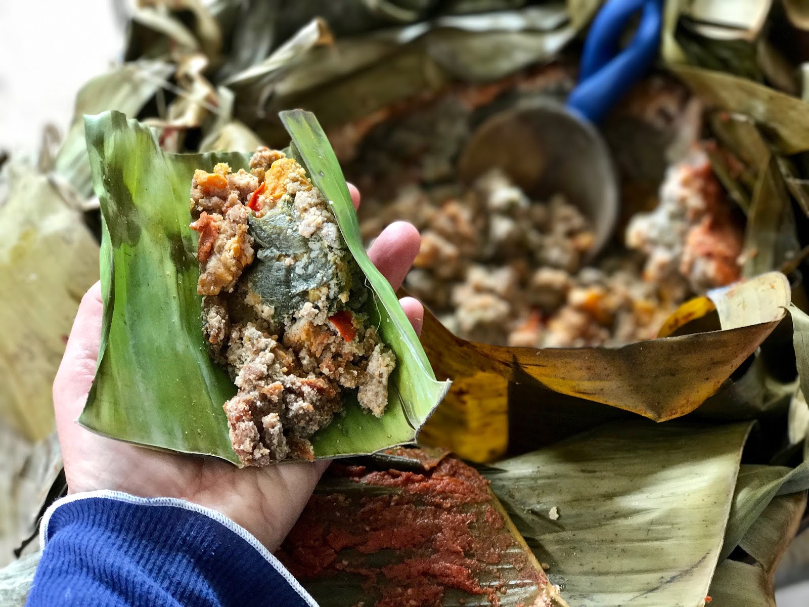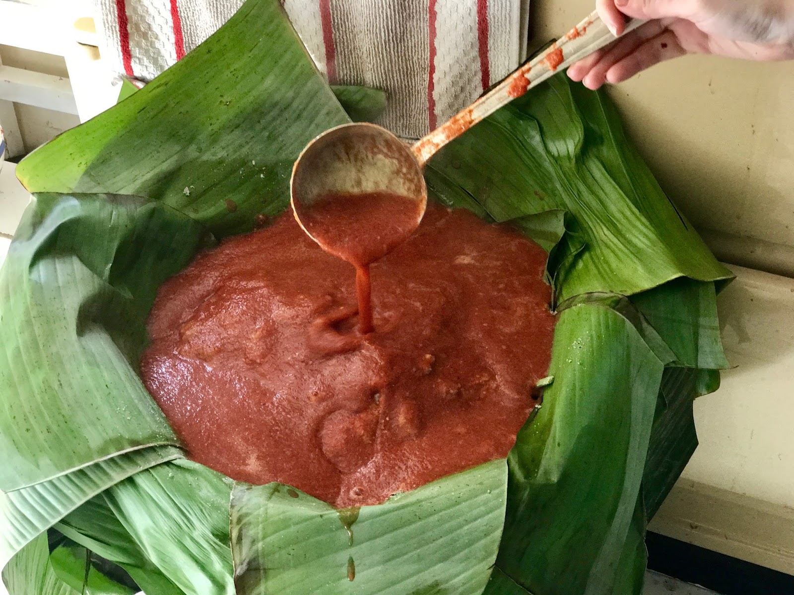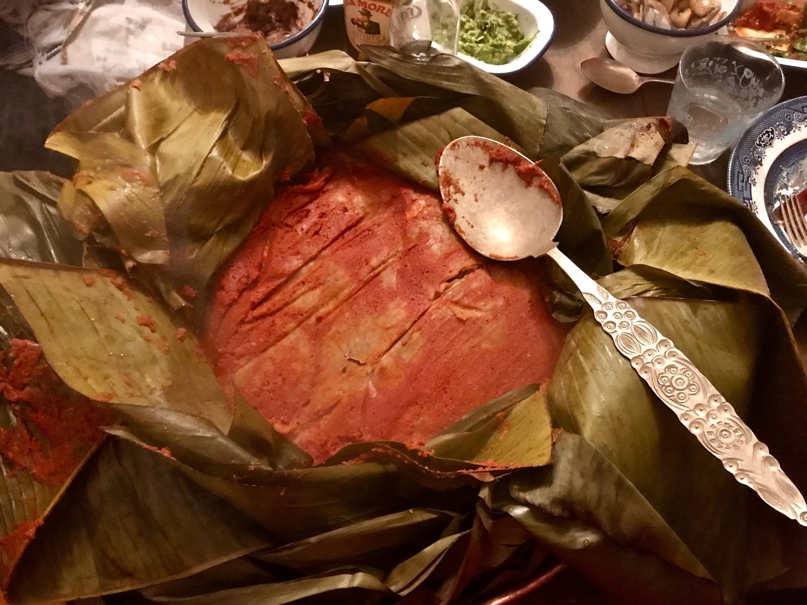 Zacahuil: Giant Tamale cooked on the Big Green Egg with Butternut Squash, Chipotle and Jitomate sauce, Rajas, Peppers, Wild Garlic and Oaxacan Cheese.