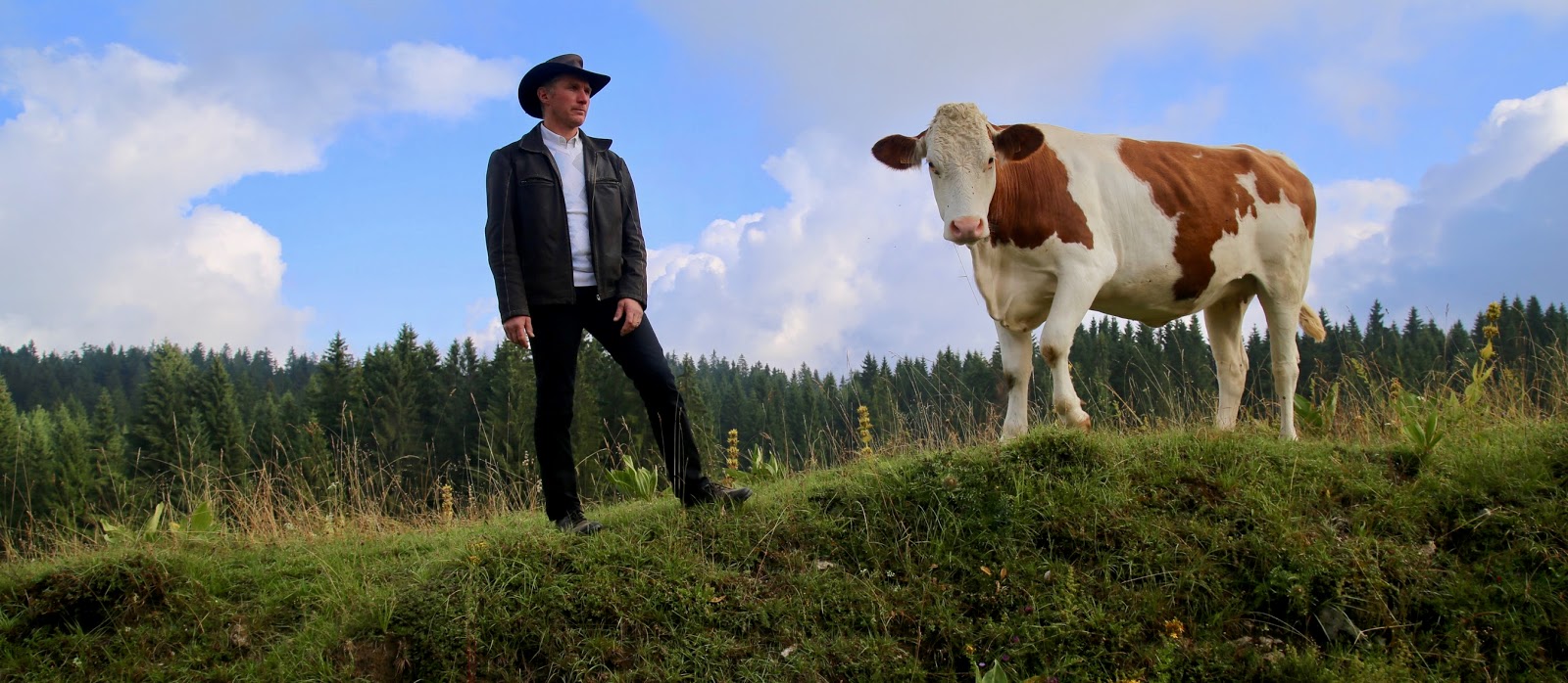 He advances sideways, eventually inclining his head, tipping his leather hat towards them, letting them smell him. The brass bell around the cows neck clangs as the cow allows him to come near, it’s a gentle scene.
