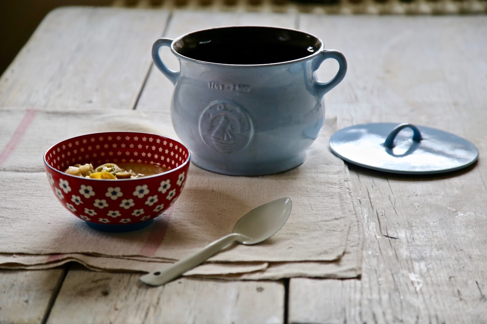 Soups benefit from a little sourness. To achieve this, add a little wine, or yoghurt, or vinegar. Here I put in pickled jalapeno pepper slices (a great store cupboard standby).