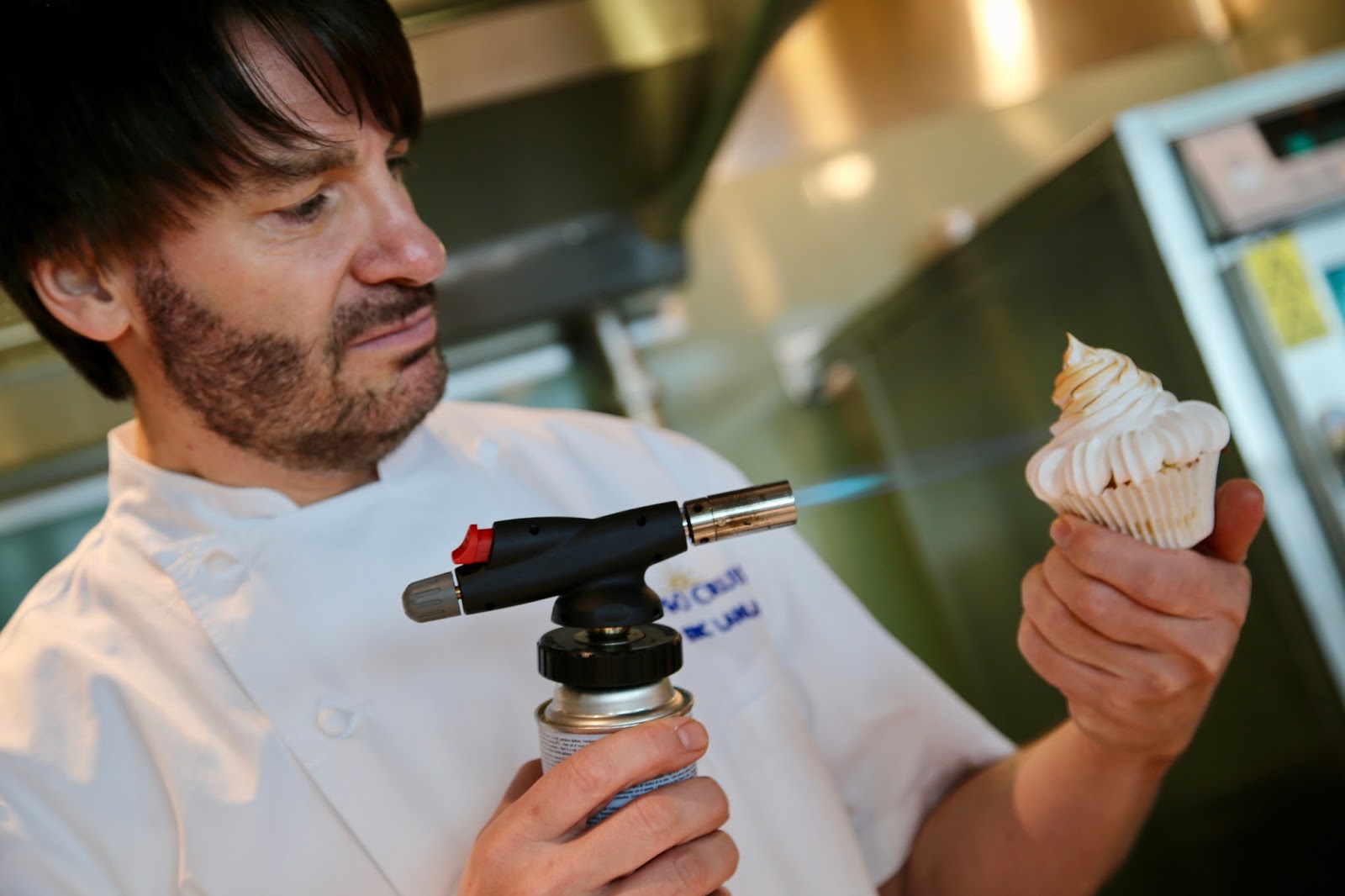 In the Masterclass, Eric showed us how to make lemon curd cupcakes with an Italian meringue topping, white chocolate cake pops and finally a salted caramel and apple souffle.
