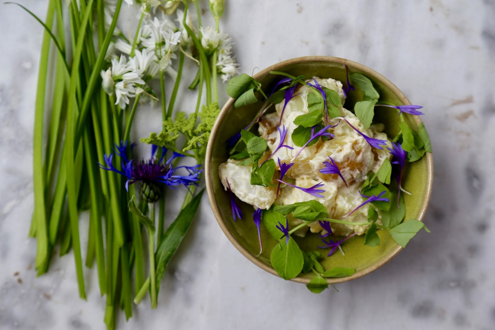 Three cornered leek and cornflower potato salad