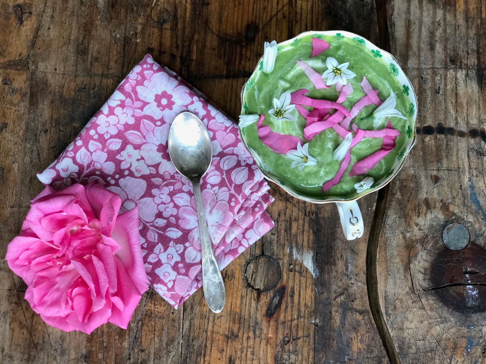 Season the soup again just before serving. Pour the soup into bowls. Garnish with the rose petals and wild garlic flowers.