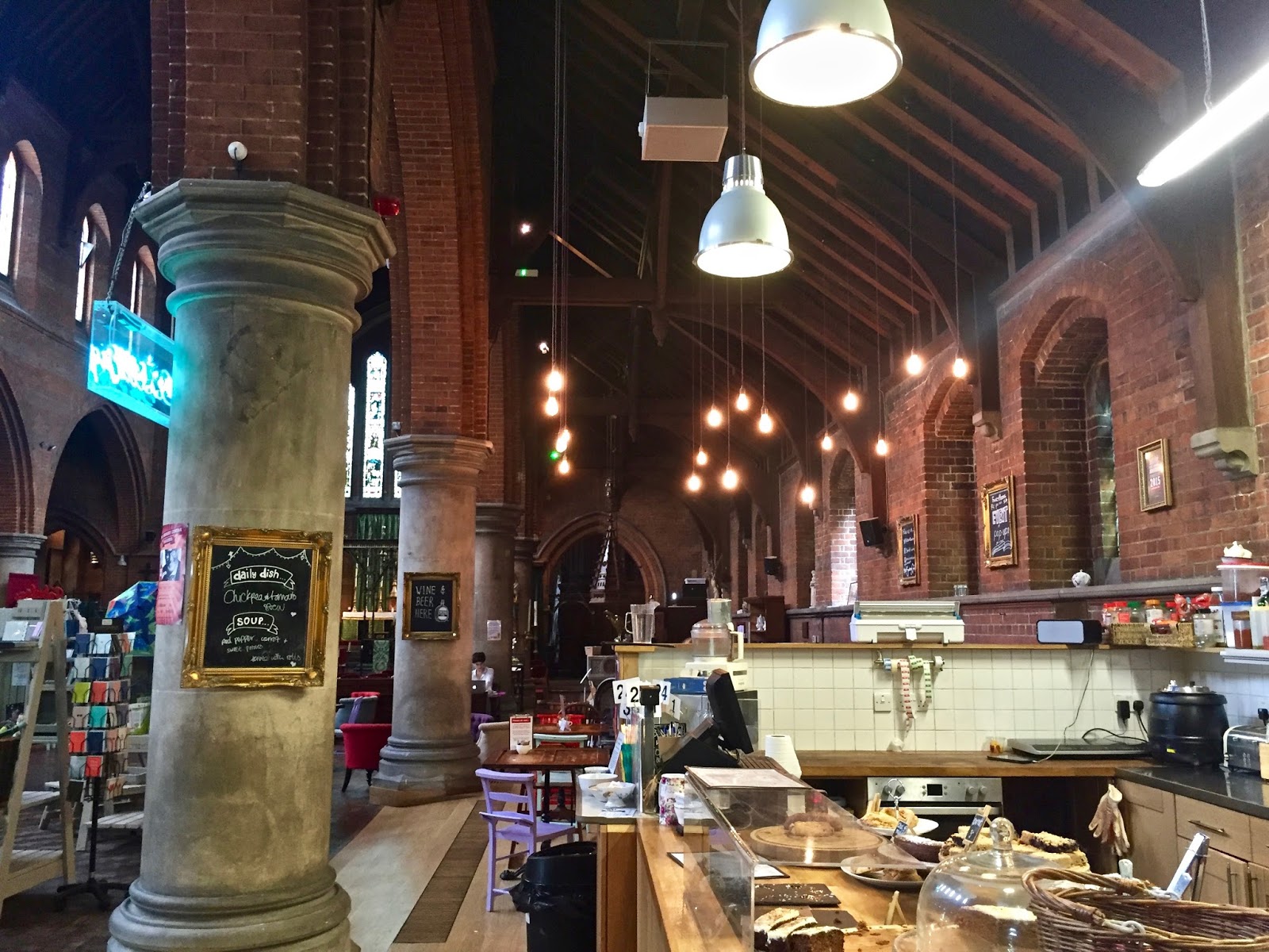Set in a church that functions as a multi-use community centre with a post office, children’s soft play park, political meetings, yoga classes, the Sanctuary café offers pots of tea, good homemade cakes and free wi-fi. All sorts come here to enjoy the lofty stained glass windows, vaulted roof, pillars, and arches while sitting on the comfy sofas and armchairs scattered behind the wooden church pews.