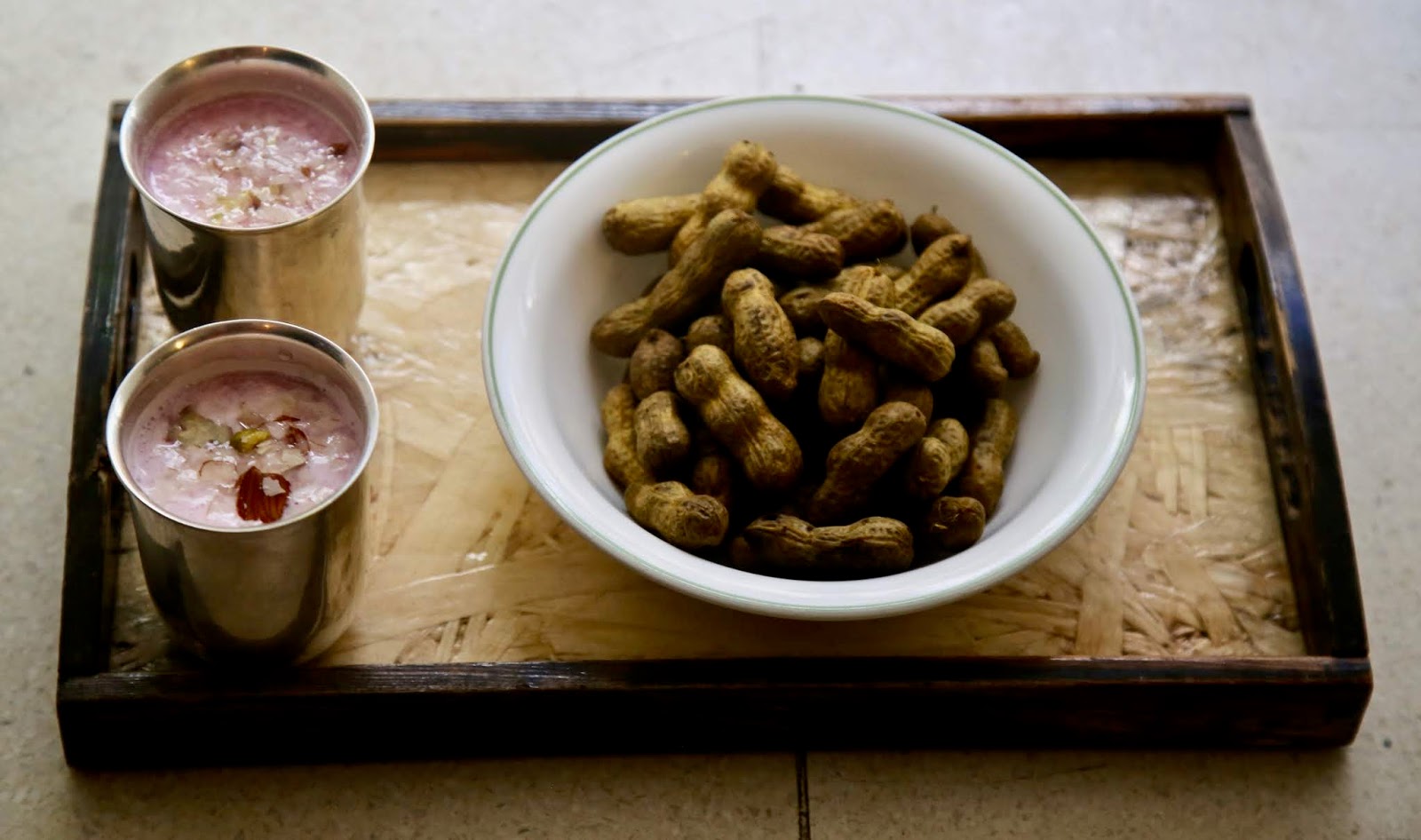 Jyoti’s family originally came from the Gujarat region, but moved to Bombay so her food was Gujurati. (Locals don’t call it Mumbai). Grandma was there too, sitting smiling on the ornate blue velvet sofa. I was handed a pink drink, flavoured with rose and fresh coconut, and, snacking on the freshest peanuts boiled in tamarind and salt, in their shells, I was shown around the flat. In one of the bedrooms there was a large swing hanging from the ceiling, held by large metal chains with tiny brass elephants.