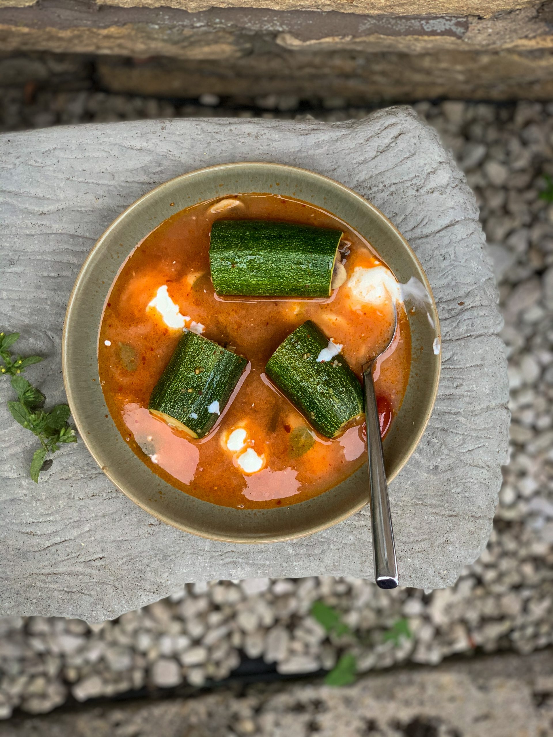 • Pour the broth into a medium oven dish. Place the stuffed courgettes in the broth and cover the dish with foil. Bake in the oven for 15 minutes or until the courgettes are cooked but not mushy.