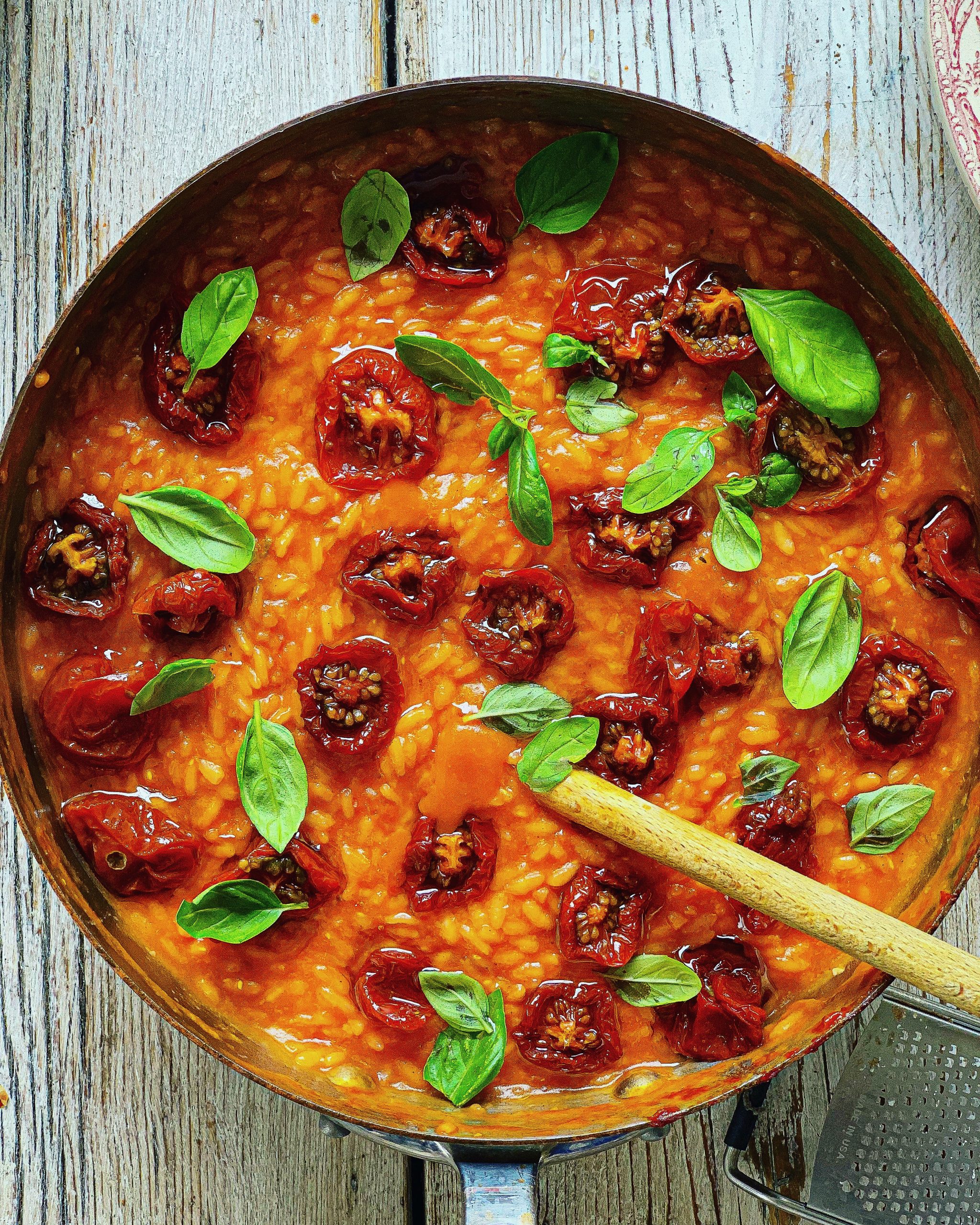 - Add the butter, take off the heat and dot the top with the smoked tomatoes and some fresh basil.