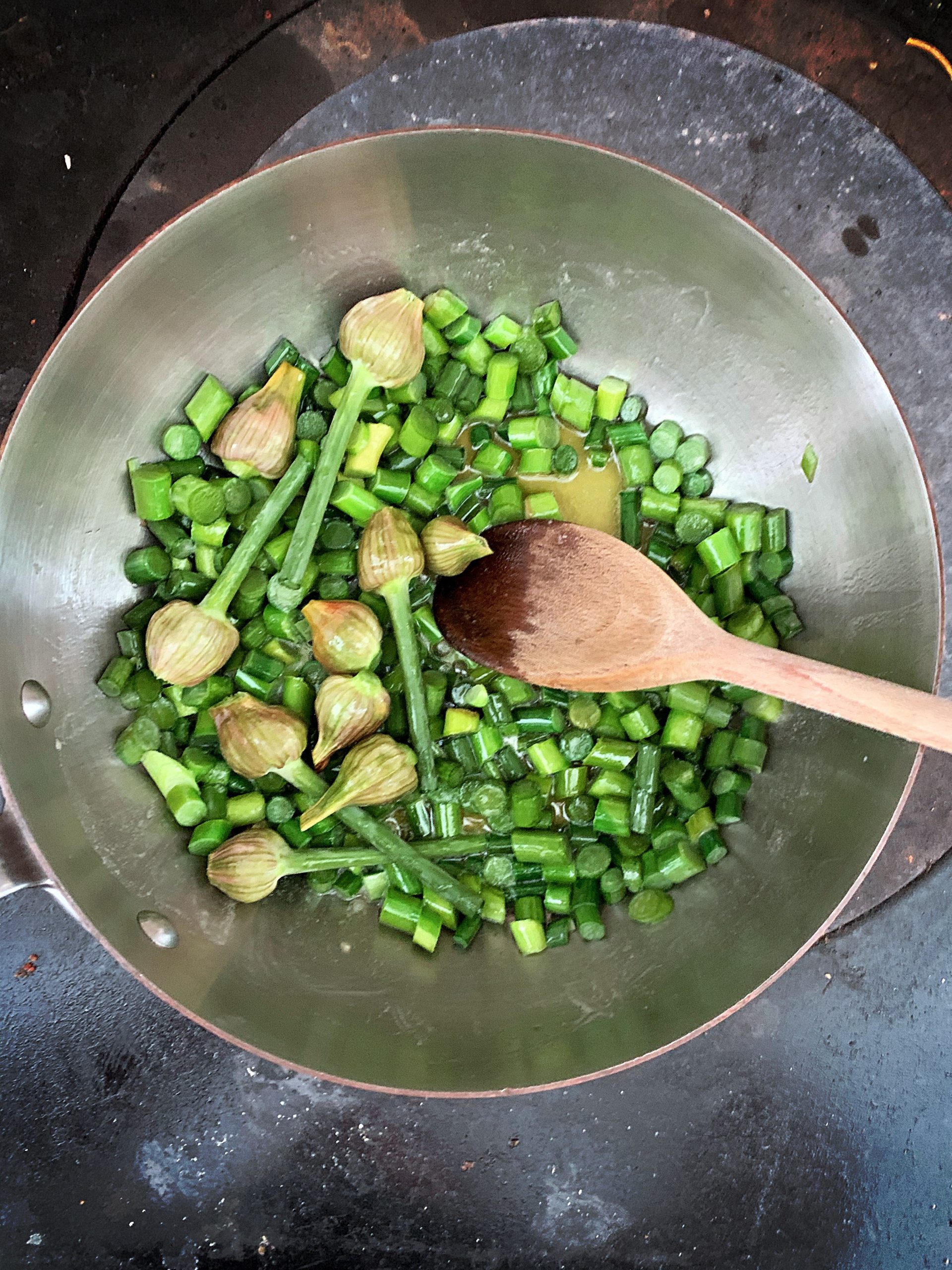 - Use the green stalks from the garlic scapes and fry in a deep frying pan in the olive oil.