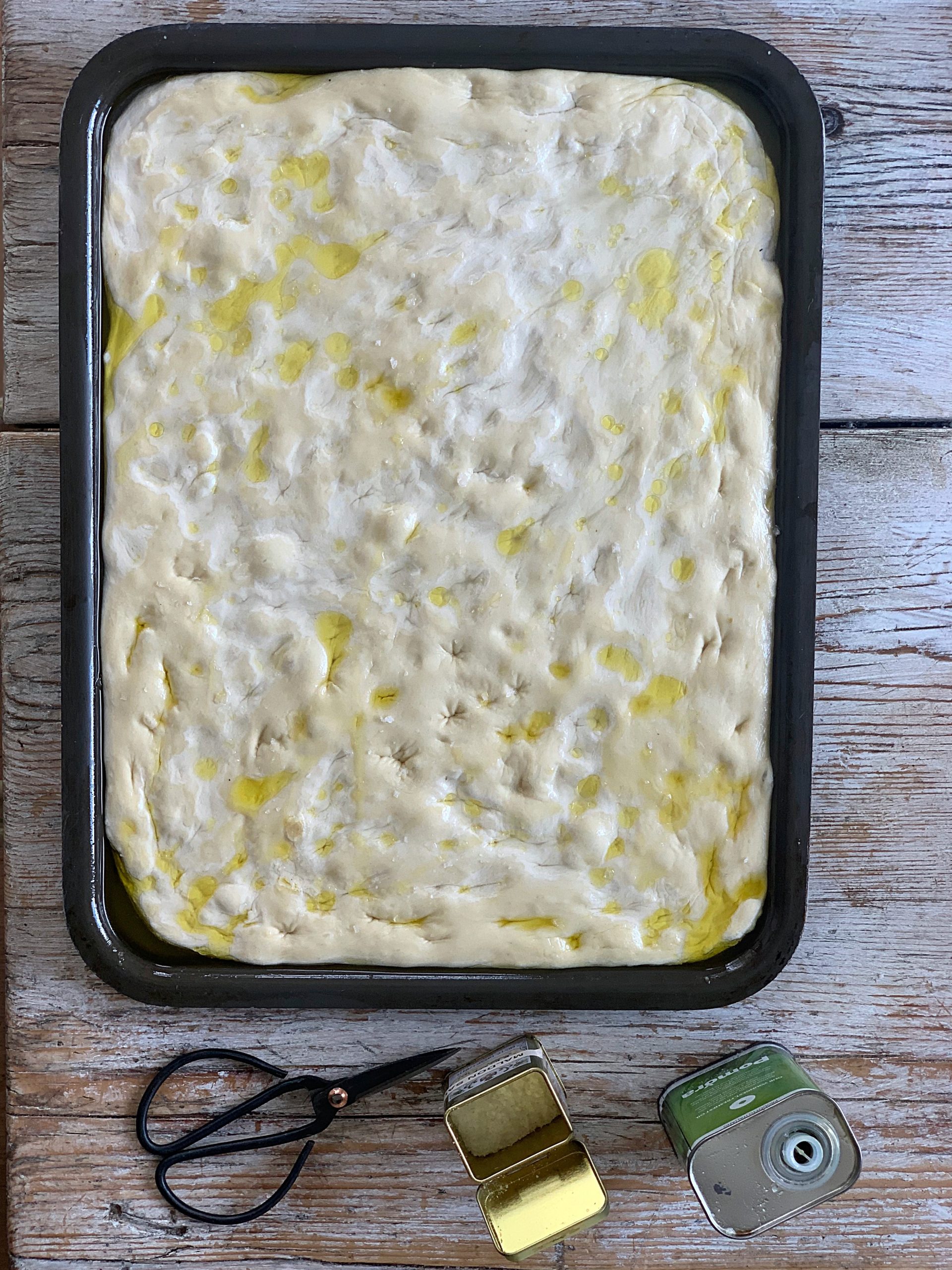 - The next morning, grease a baking tray with olive oil and pour the risen dough into it. Gently pull out the corners of the dough to spread it to the edges of the tray. Go back a couple of times and continue to pull. Eventually it will settle into the shape of the tray.