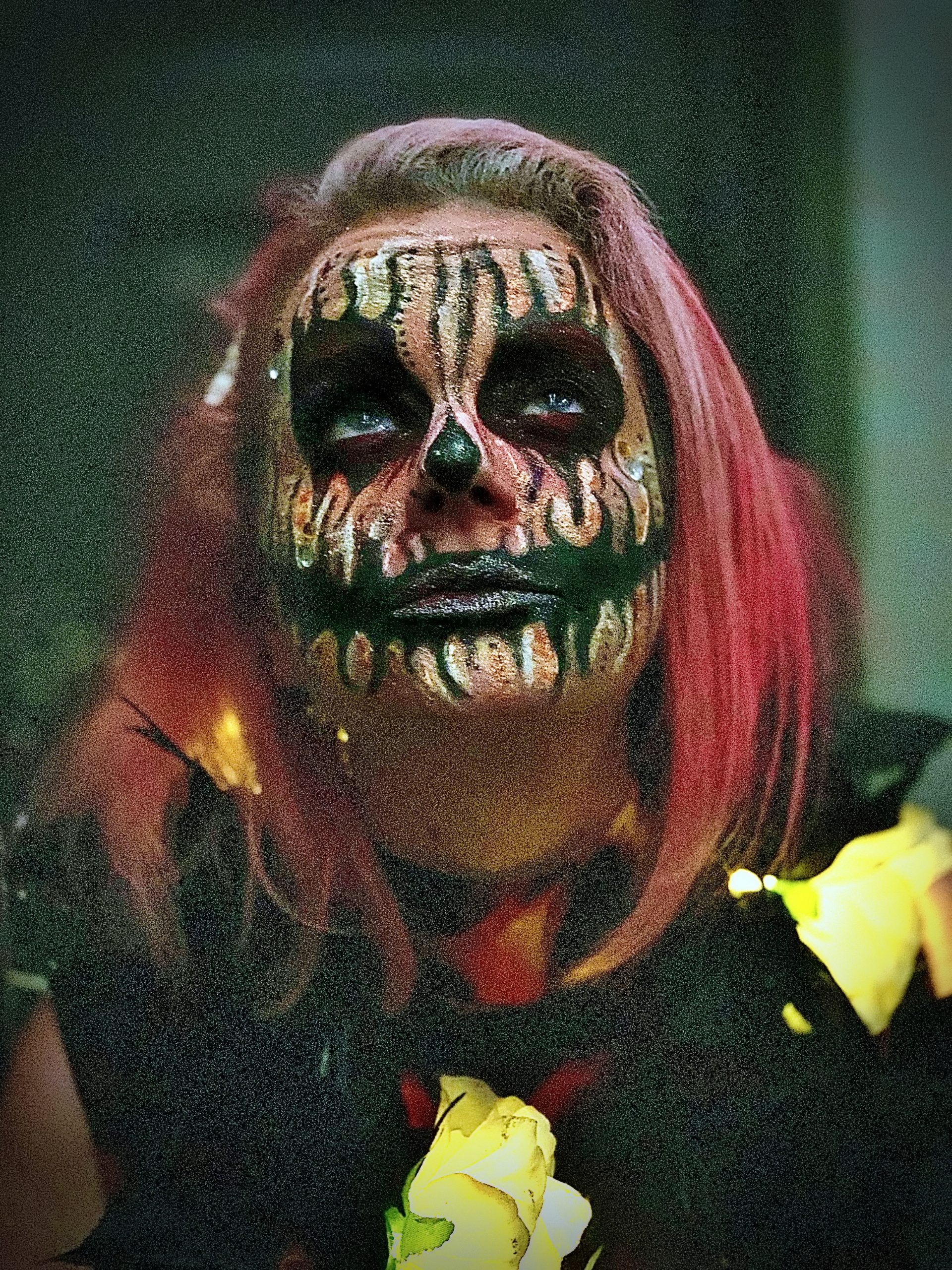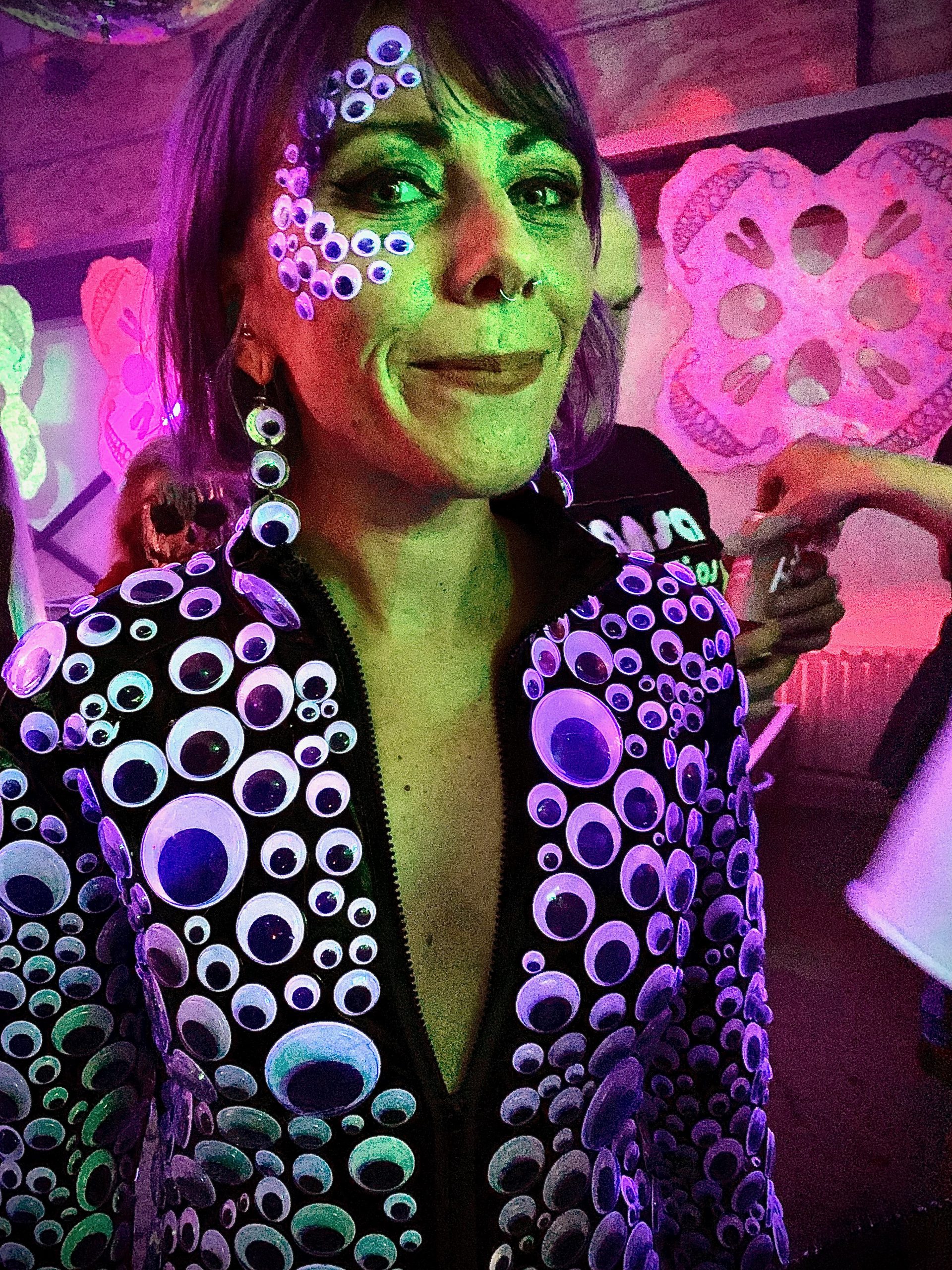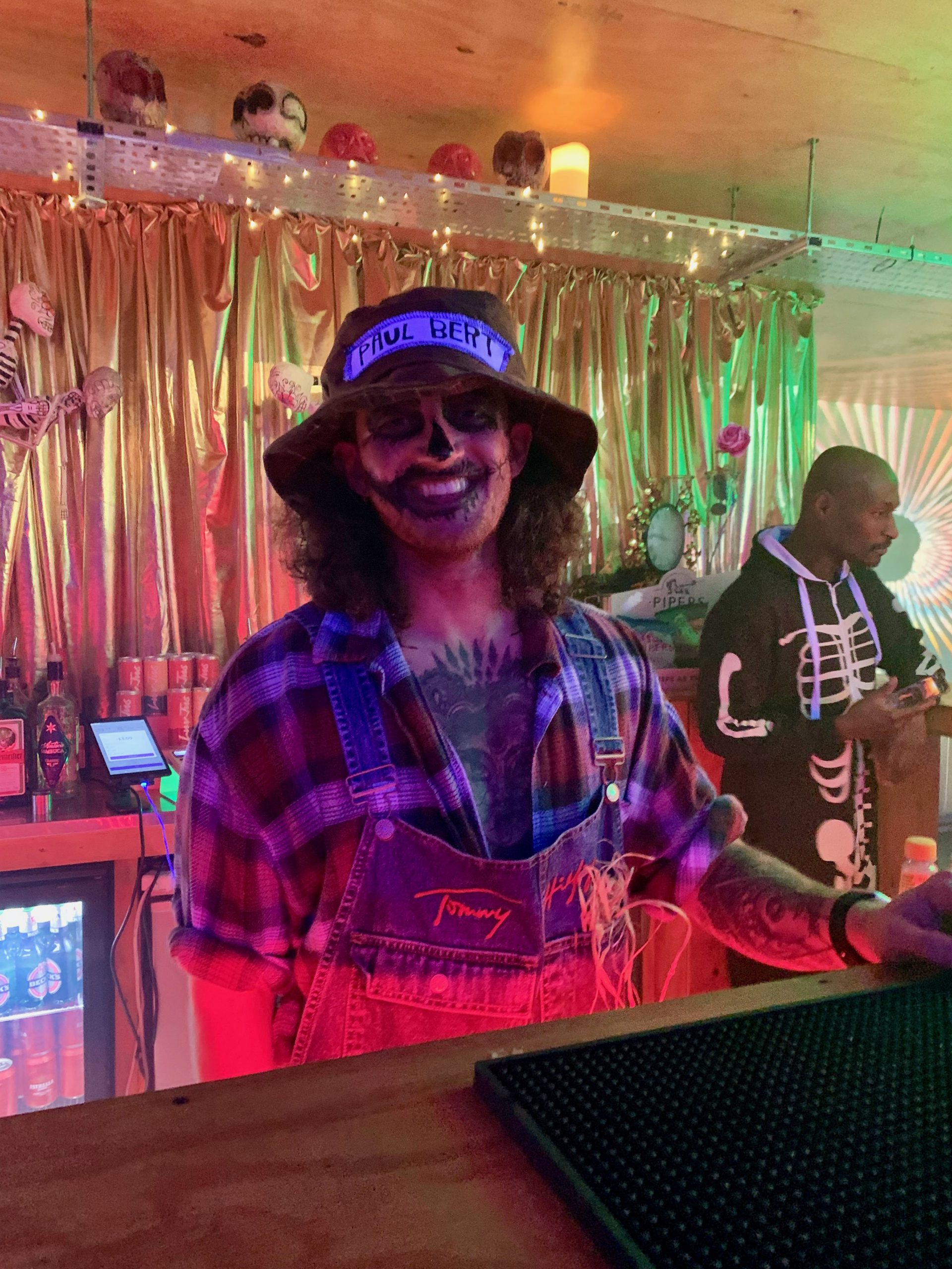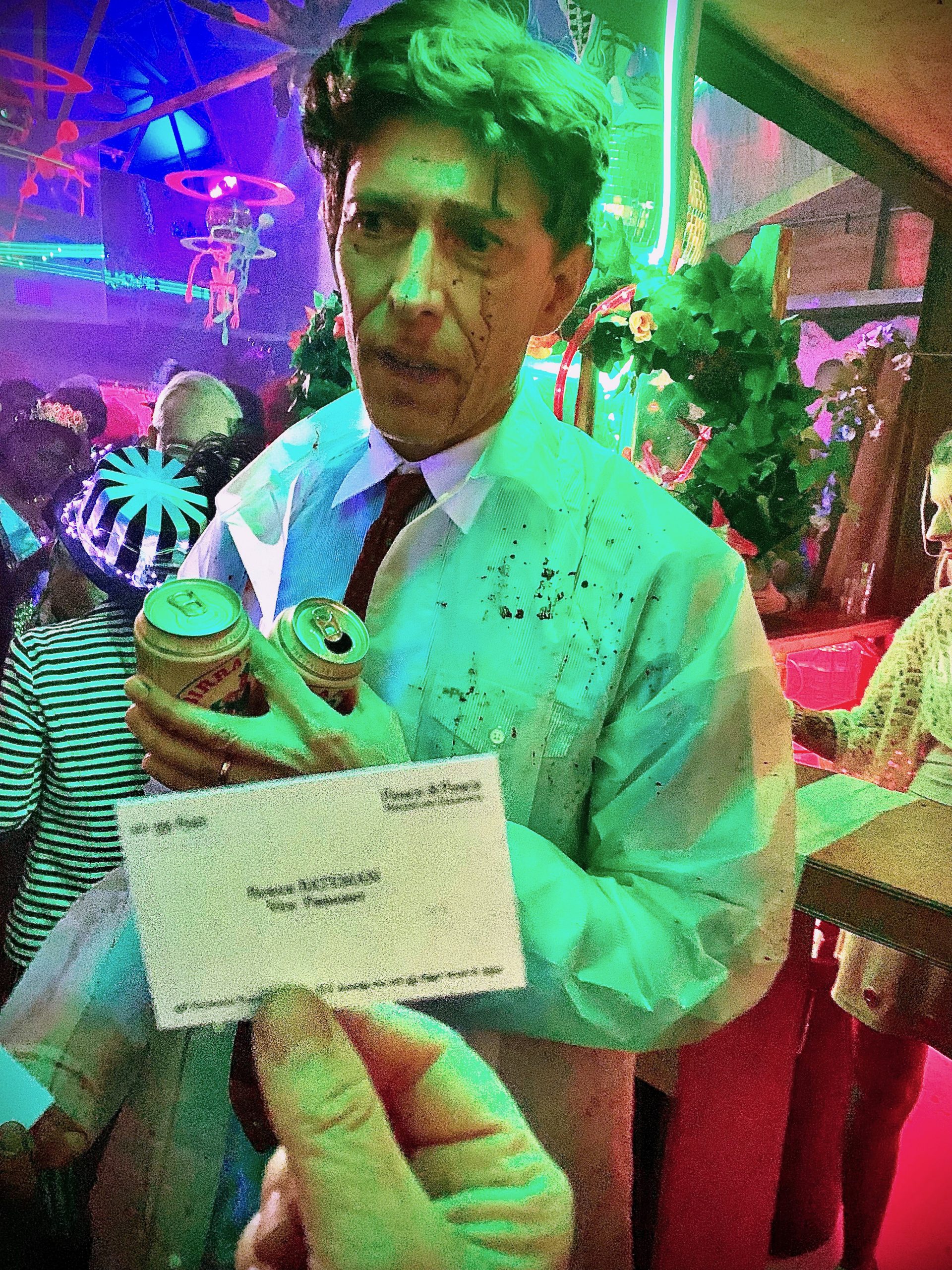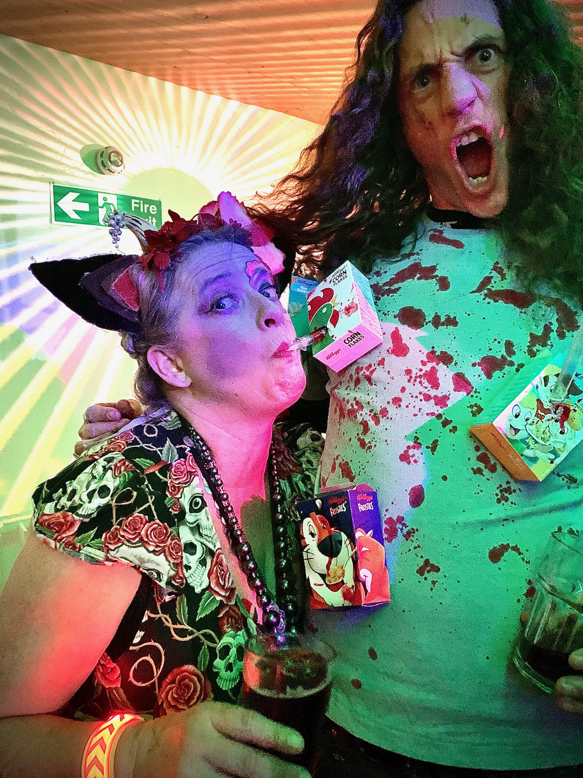 It felt like this Halloween was England thumbing its nose at Death. We were asked to bring Rapid Flow Test results. I’m not sure how the door would know when they were taken. They weren’t scanned. Nobody wore masks, unless you are counting Halloween costumes. One guy came as Covid itself, a huge papièr maché head in green with the familiar spikes.