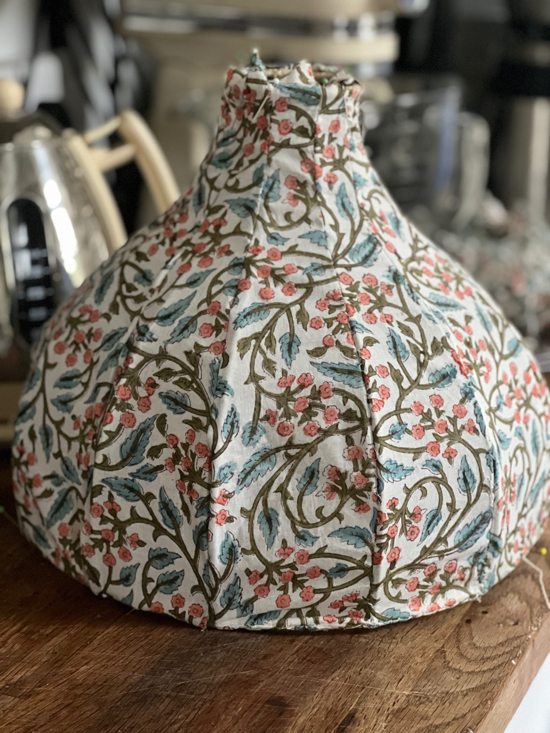 You learn the properties of fabric. For my next lampshade I will be considering the stretchiness of the fabric, the size and repeat of the pattern, the weight and transparency of the fabric. Each style requires a different sort. I was proud of my finished lampshade. I was given a kit to attempt another on my own.